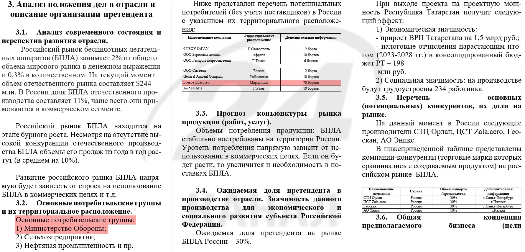 Так, у бізнес-плані проєкту з виробництва безпілотників на території особливої економічної зони від 16 січня 2023 воєнні злочинці чітко вказували міністерство вбивства Росії як основну споживчу групу власного товару.