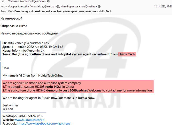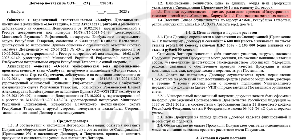 У закупівлях корпус має відмітку "Побутова електроніка", але про його причетність до виробництва "Шахедів" свідчить проєкт договору, надісланий Флорову заступником керівника проєкту виробничого відділу моторних човнів Ніязом Гайфулліним.