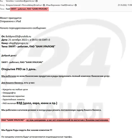 Банк не під санкціями, будемо раді співпраці (с) / Скриншот із пошти Олексія Флорова