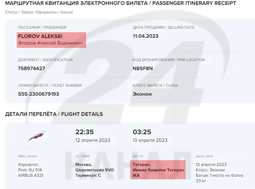Квитки Флорова до Тегерану / Скриншот із пошти російського терориста