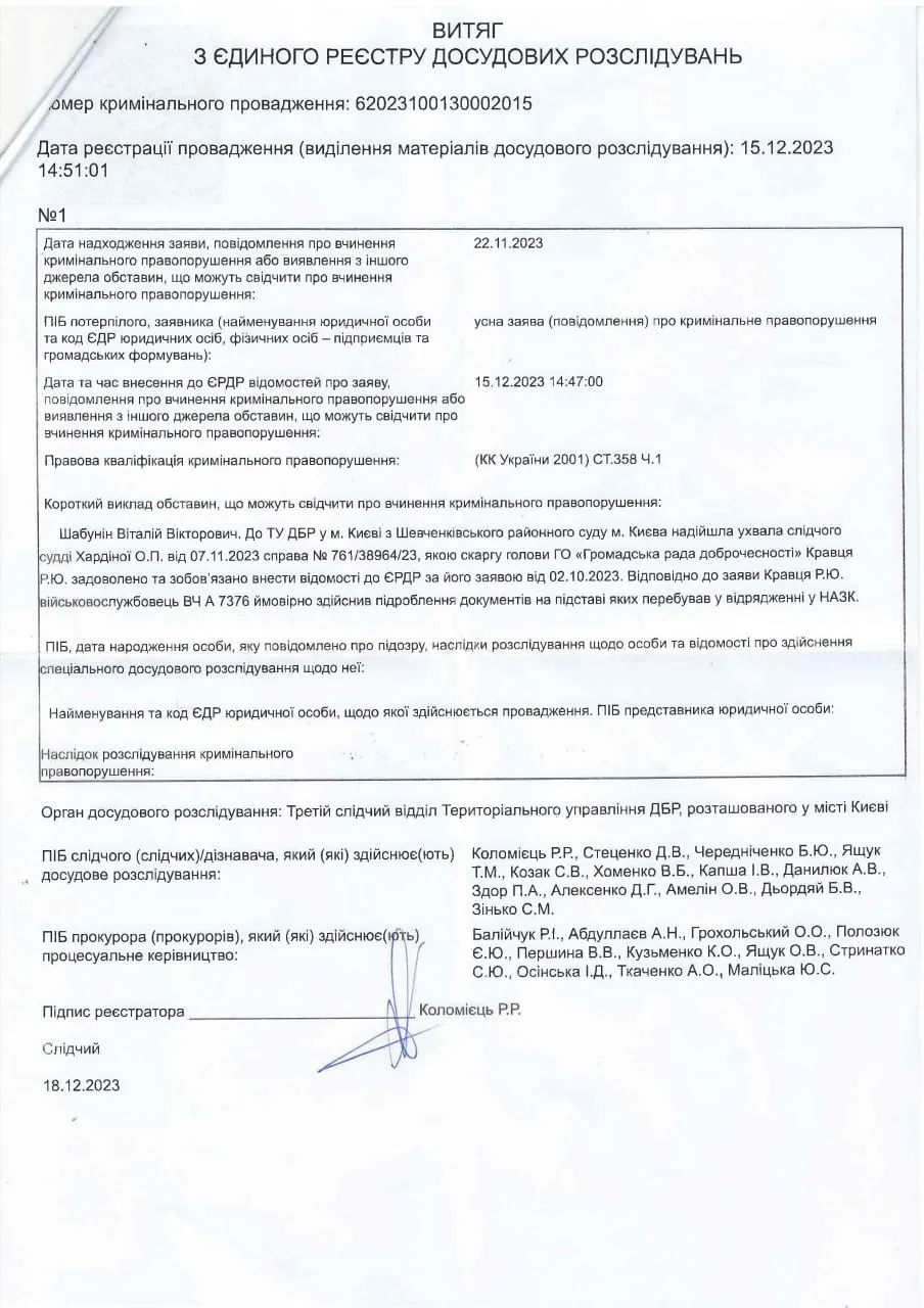 Як повідомляє журналіст Володимир Бойко, проти Шабуніна розпочало провадження за статтею про ухилення від військової служби. Зокрема, його звинувачують за статтею про підроблення офіційного документа. Бойко навіть оприлюднив витяги з реєстру, інформує 24 Канал.