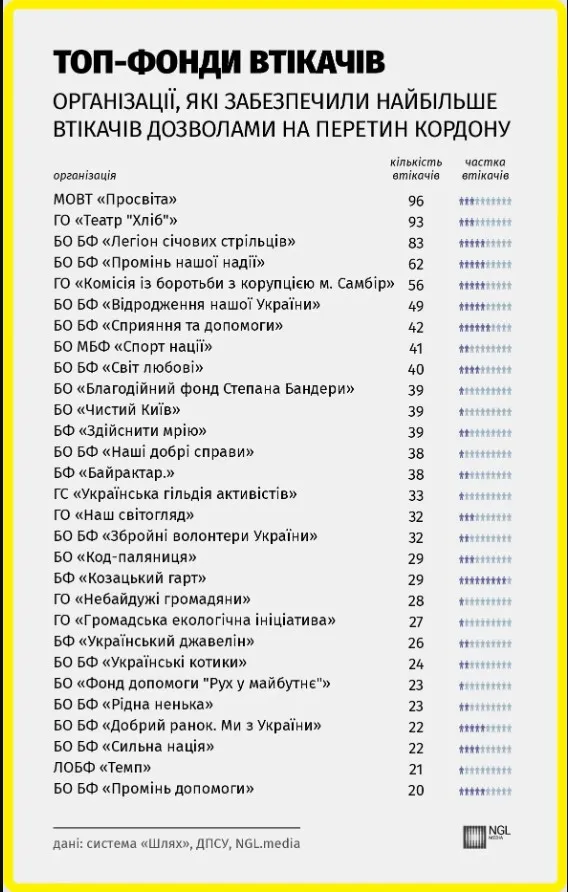 Найбільше ухилянтів пройшло через дві організації, які ведуть діяльність за однією адресою у місті Миколаїв Львівської області – місцевий осередок всеукраїнського товариства "Просвіта" і ГО "Театр Хліб". Лише від цих двох організацій змогли втекти майже 200 чоловіків.