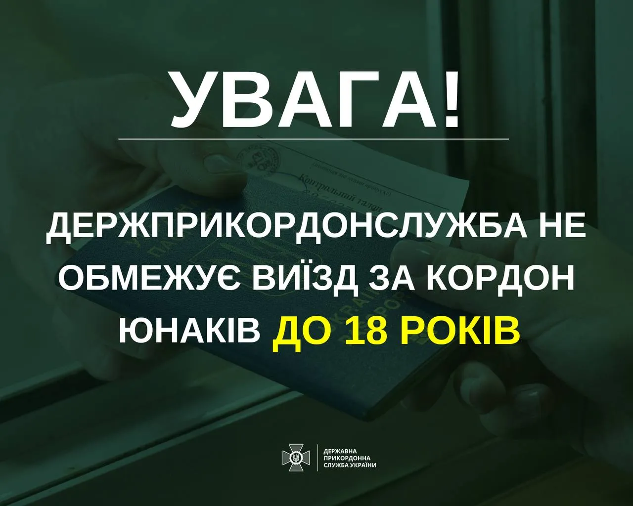 У зв'язку з появою на інформаційних ресурсах повідомлень щодо заборони виїзду з України 17-річним юнакам, вносимо роз'яснення. Після введення в Україні воєнного стану обмежено виїзд громадянам України чоловічої статі віком від 18 до 60 років (окрім визначених винятків). На 17-річних юнаків ці обмеження не розповсюджуються,