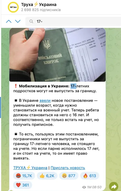Не стояли осторонь і популярні телеграм-канали, що не втрачають жодної можливості хайпанути та зібрати тонни лайків. До прикладу, допис на каналі "Труха" з провокативним заголовком зібрав 1 мільйон переглядів.