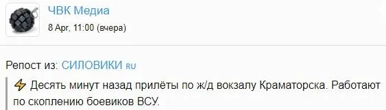- За день до ракетної атаки окупанти на своїх телеграм-каналах поширили інформацію, що жителям Краматорська і Слов’янська не варто евакуйовуватися через залізничні вокзали. Натяк зрозумілий…