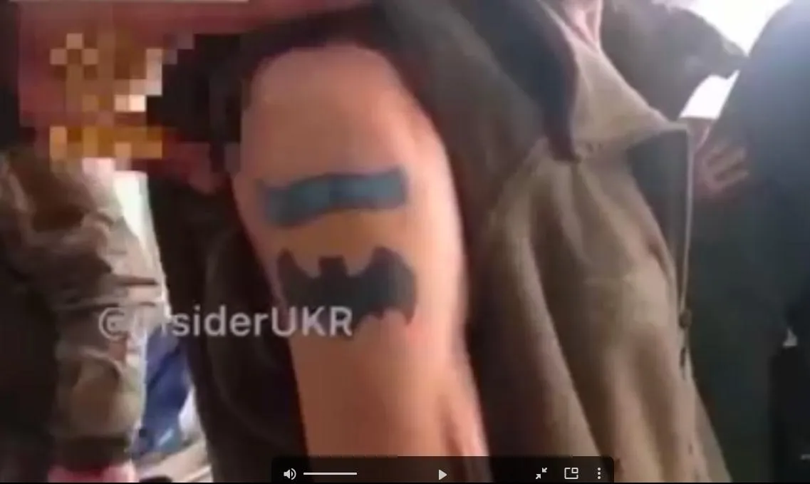 "Снайпера" змушують роздягнутися, й одразу видно його показові "татуювання" – прапор України і кажан.