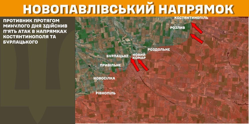 На Новопавлівському напрямку окупанти здійснили 5 атак в напрямках Костянтинополя та Бурлацького.