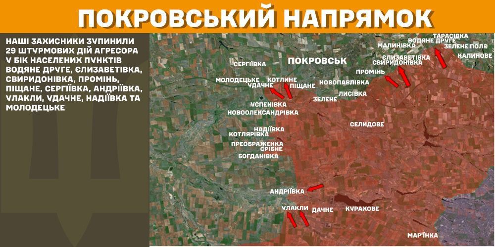 На Покровському напрямку українські воїни зупинили 29 штурмових дій росіян у бік населених пунктів Водяне Друге, Єлизаветівка, Свиридонівка, Промінь, Піщане, Сергіївка, Андріївка, Улакли, Удачне, Надіївка та Молодецьке.
