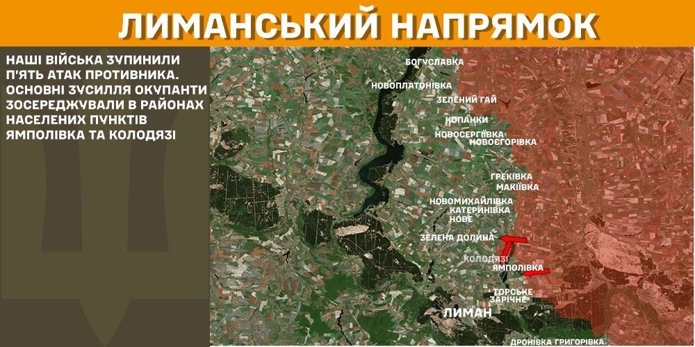 На Лиманському напрямку росіяни атакували сім разів та намагалися вклинитися в українську оборону поблизу населених пунктів Копанки, Новолюбівка, Терни, Ямполівка та Колодязі.