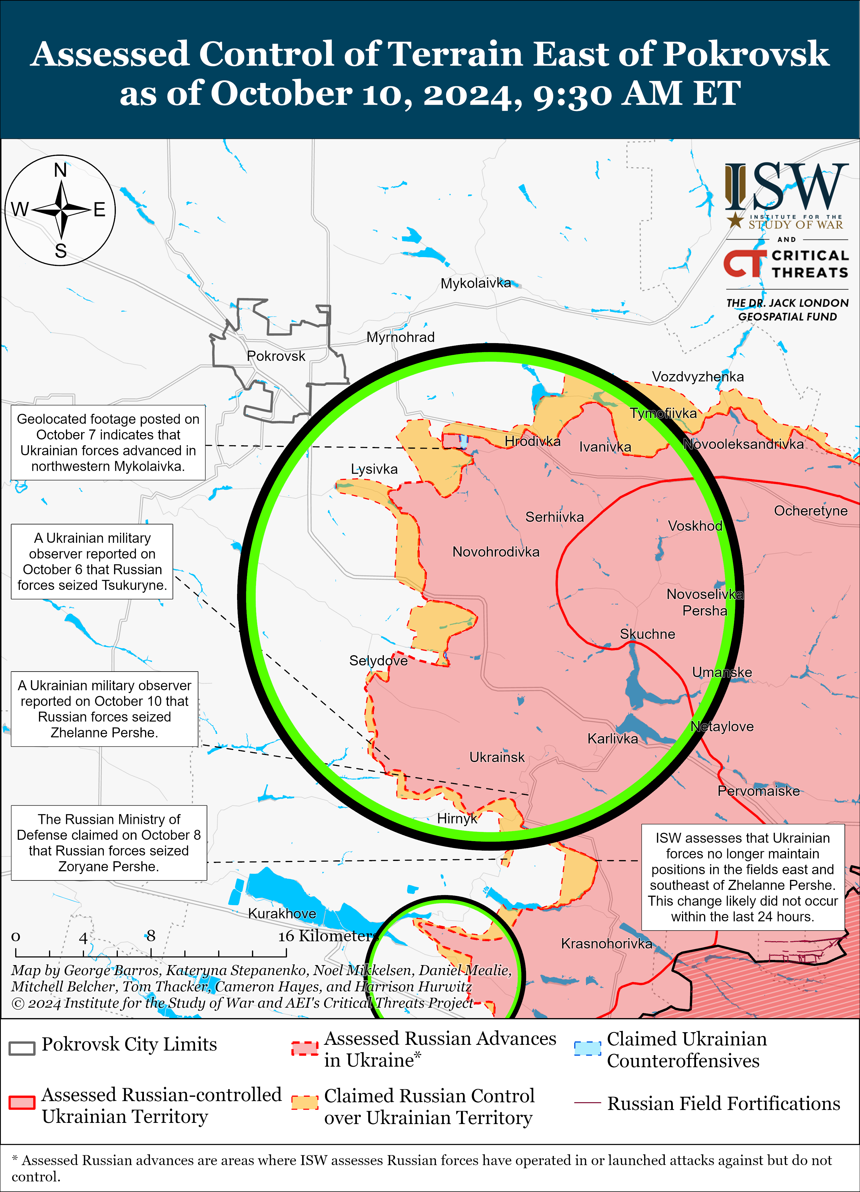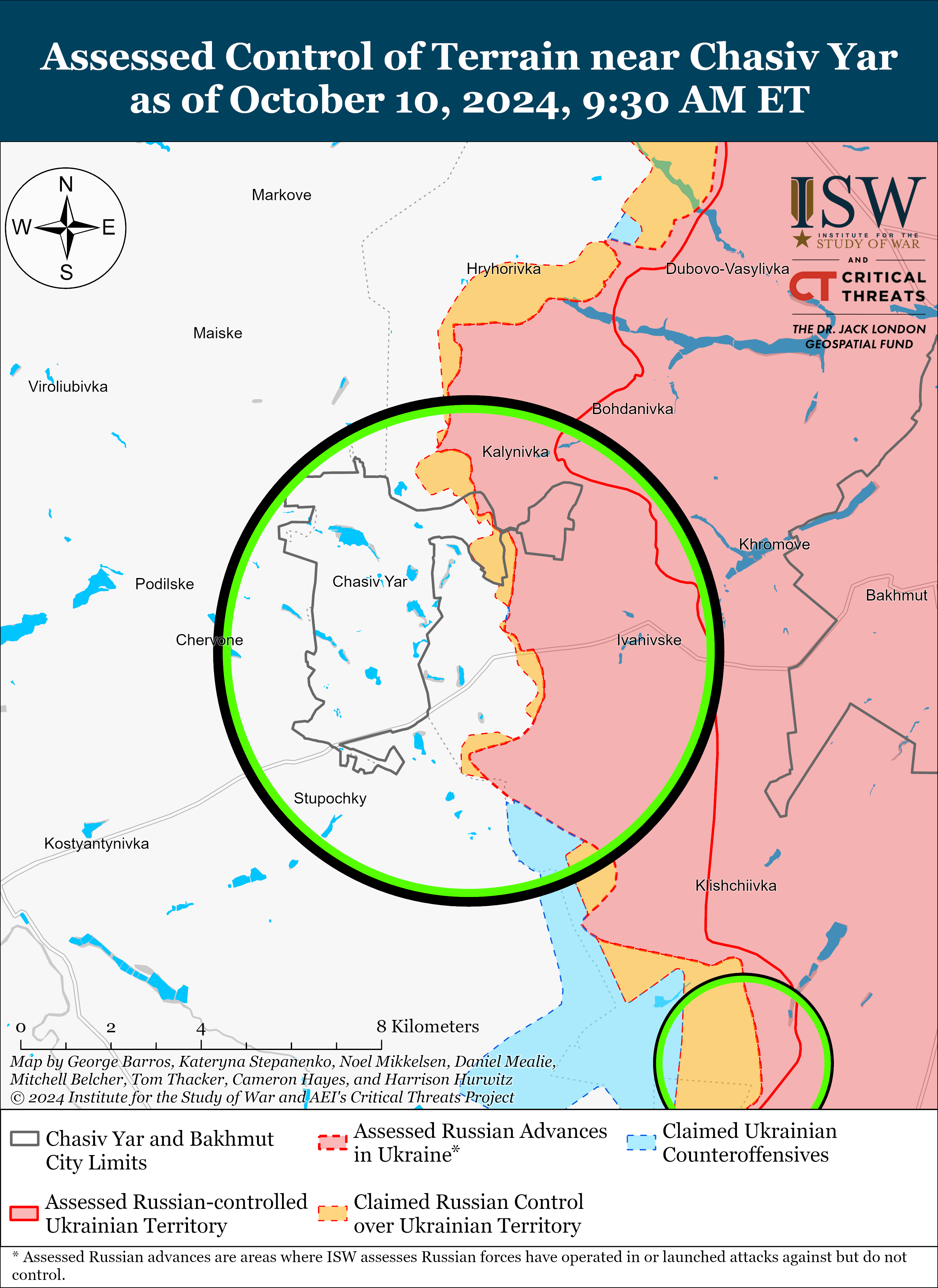 Українські сили нещодавно відбили деякі позиції в межах і на південь від Торецька. Геолокаційні кадри 9 і 10 жовтня показують, що ЗСУ просунулися на північ від Неліпівки. А проте російські війська продовжували наземні атаки навколо Торецька.