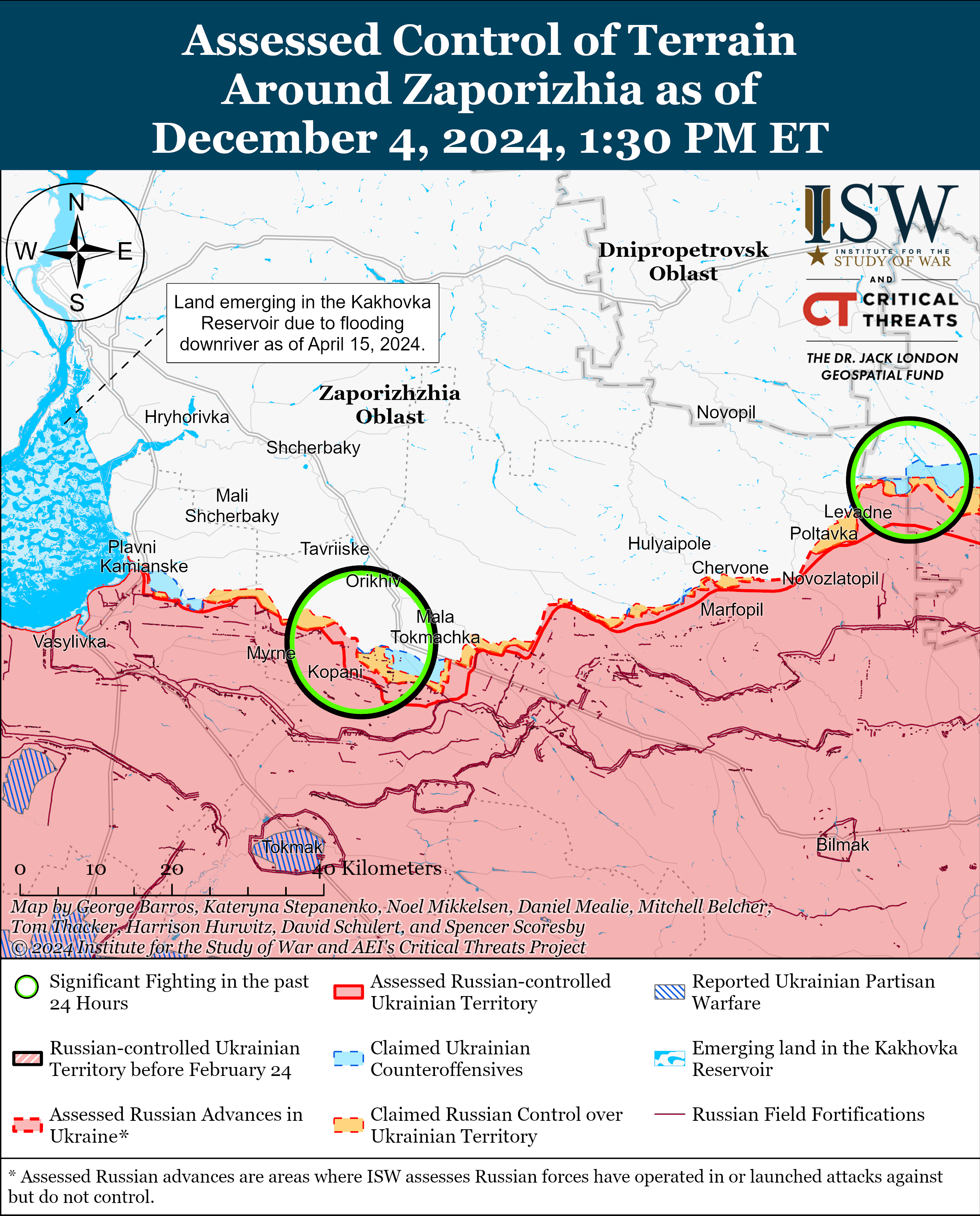 Російські війська продовжували наступальні операції на заході Запорізької області поблизу Роботиного, Новоандріївки (на північний захід від Роботиного) та Новоданилівки (на північ від Роботиного) 3 та 4 грудня, але не досягли жодних успіхів у просуванні.