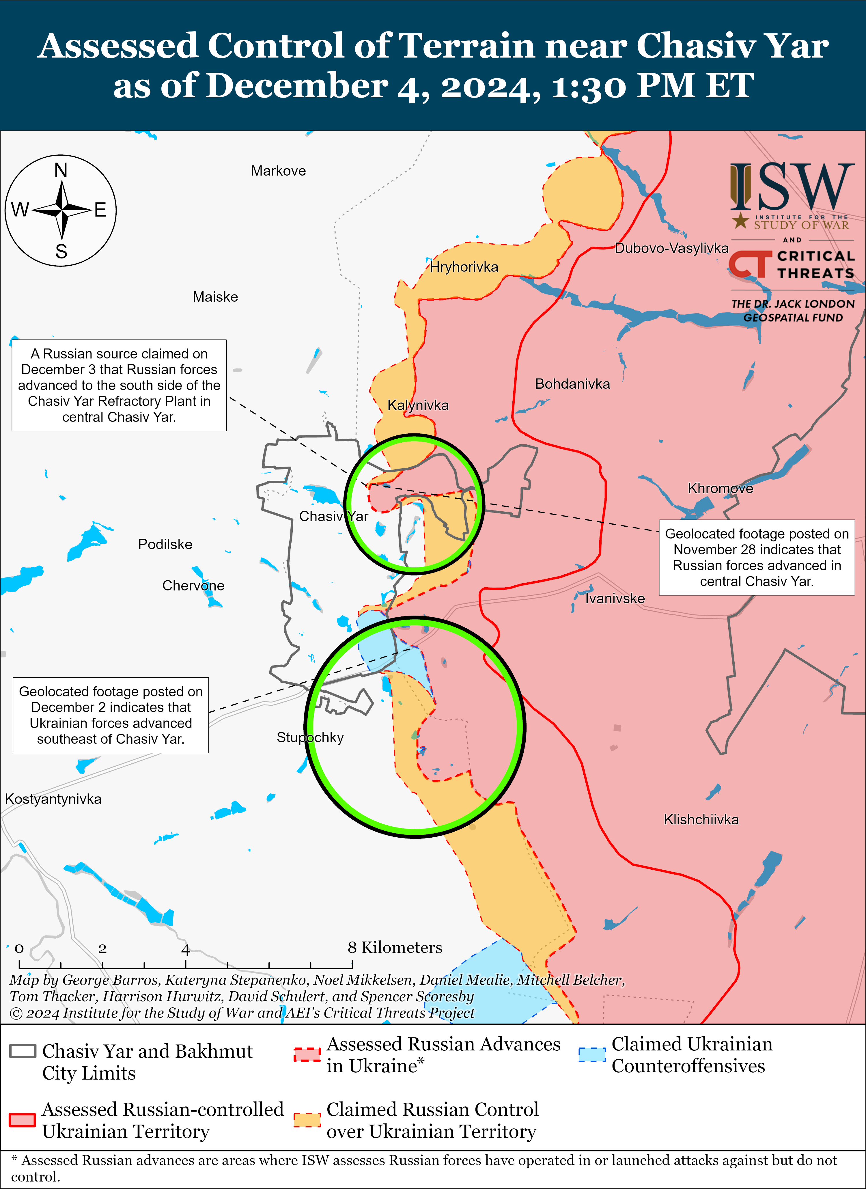 Окупанти незначно просунулися вглиб Часового Яру – імовірно, мова про вогнетривкий завод. Вони продовжували атакувати в межах Часового Яру та на південь від міста в районі Ступочок і Білої Гори 3 і 4 грудня.
