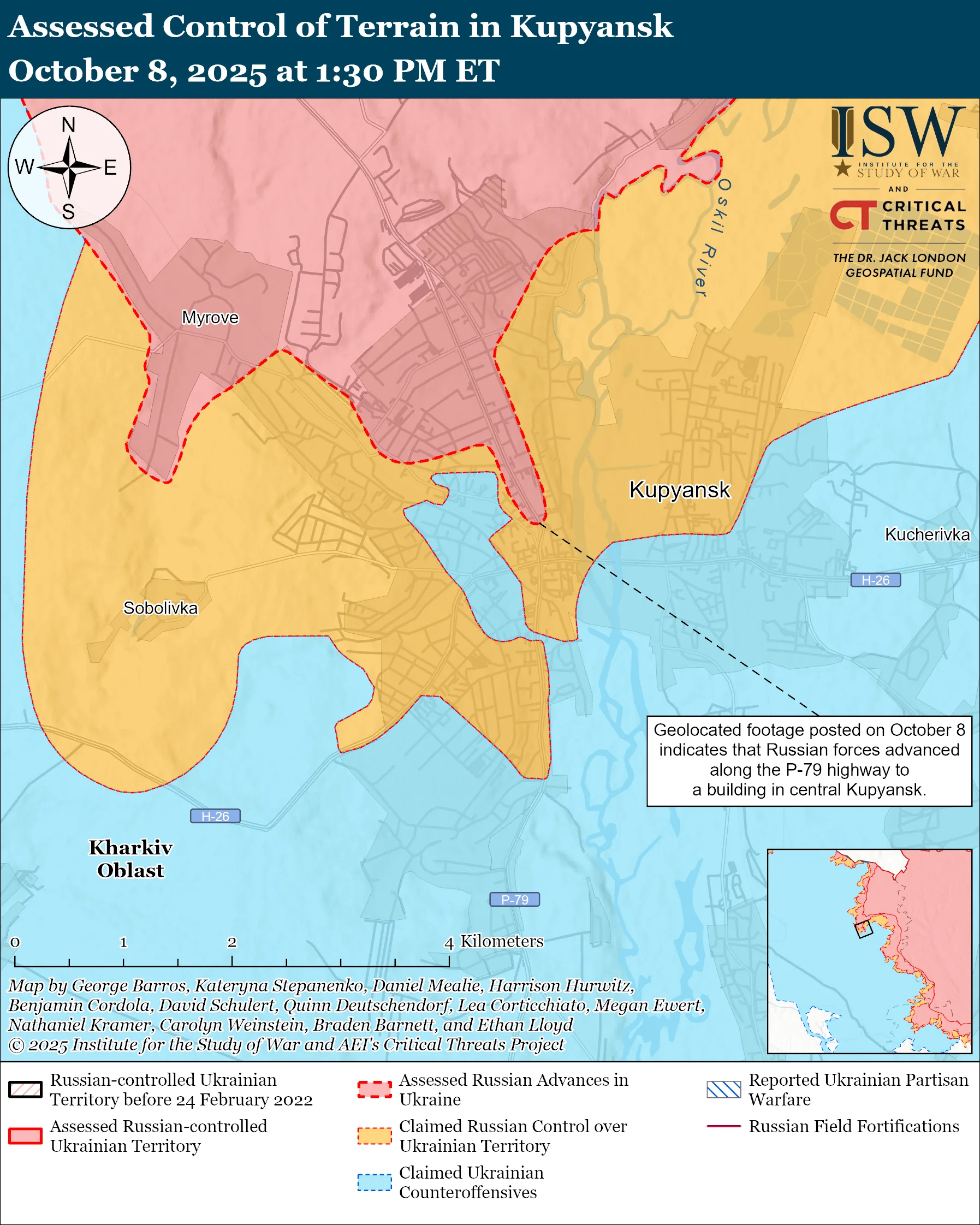 Російські війська продовжили наступальні операції на Лиманському напрямку 8 жовтня, але не просунулися вперед. Російські війська атакували на північний захід від Лимана поблизу Дробишевого, Дерилового, Новоселівки, Шандриголового та Середнього; на північ від Лимана поблизу Карпівки та Новомихайлівки; на схід від Лимана поблизу Зарічного та Торського; та на південний схід від Лимана поблизу Ямполя.
