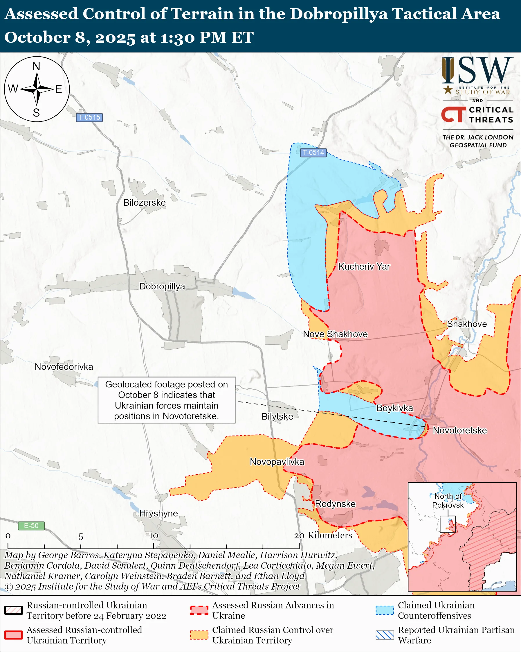Українські війська, своєю чергою, втримують позиції або здійснюють контратаки в районі Добропілля. Геолокаційні відеозаписи, опубліковані 8 жовтня, свідчать про те, що українські війська утримували позиції або просувалися в центральній Бойківці та в південному Новоторецькому. Бої тривають поблизу Кучерівого Яру, Шахового, Вільного, Заповідного, Іванівки, Бойківки, Затишок і Нового Шахового.