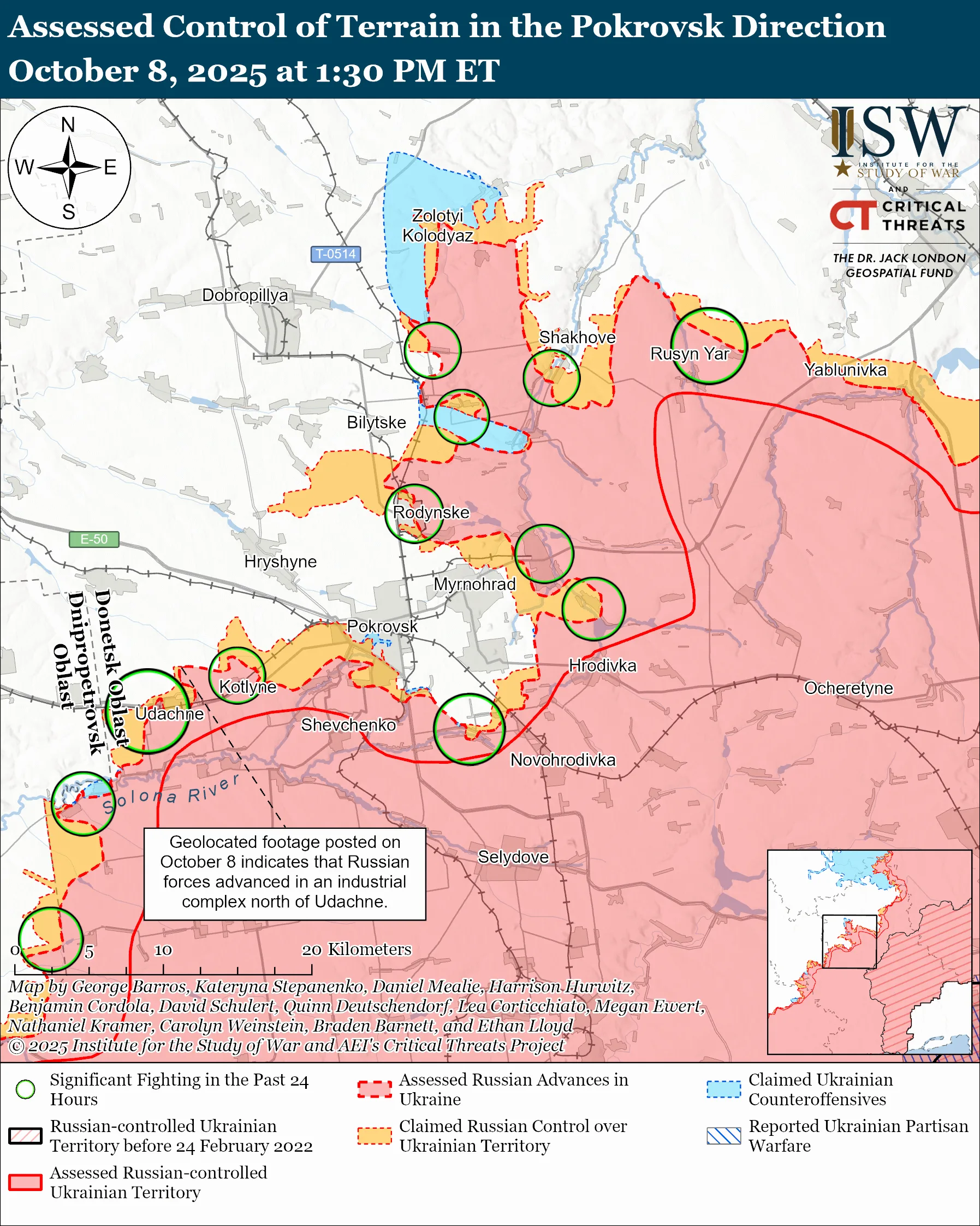 Російські сили також намагаються розвинути наступ у напрямку Покровська. Геолокаційні матеріали свідчать про їхнє просування в районі Удачного. Противник вів бої біля поблизу самого Покровська, Родинського, Сухецького, Красного Лиману, Новоекономічного, Мирнограда, Миролюбівки, Лисівки, Котлиного, Молодецького та Балагана.