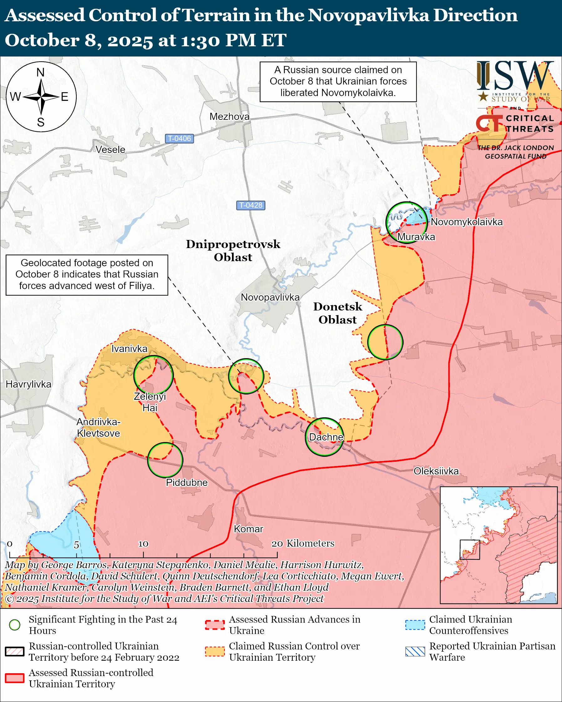Активні бої тривають і на Новопавлівському напрямку. Російські війська мають часткове просування в районі Філії, атакували в напрямку самої Новопавлівки, поблизу Новомиколаївки, Муравки, Горіхового, Дачного та самої Новопавлівки.