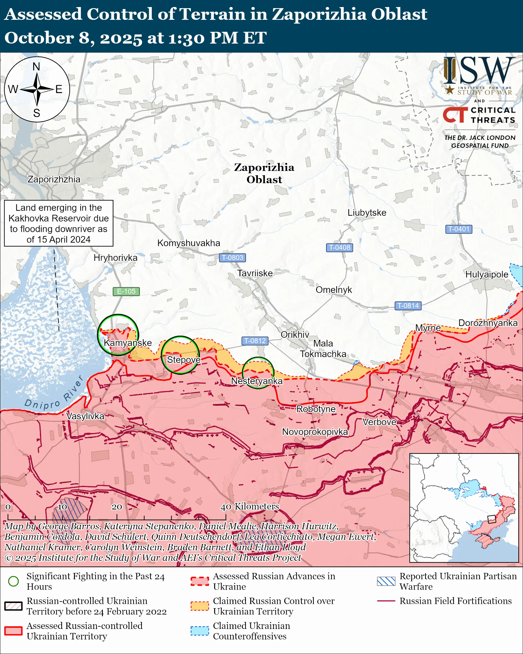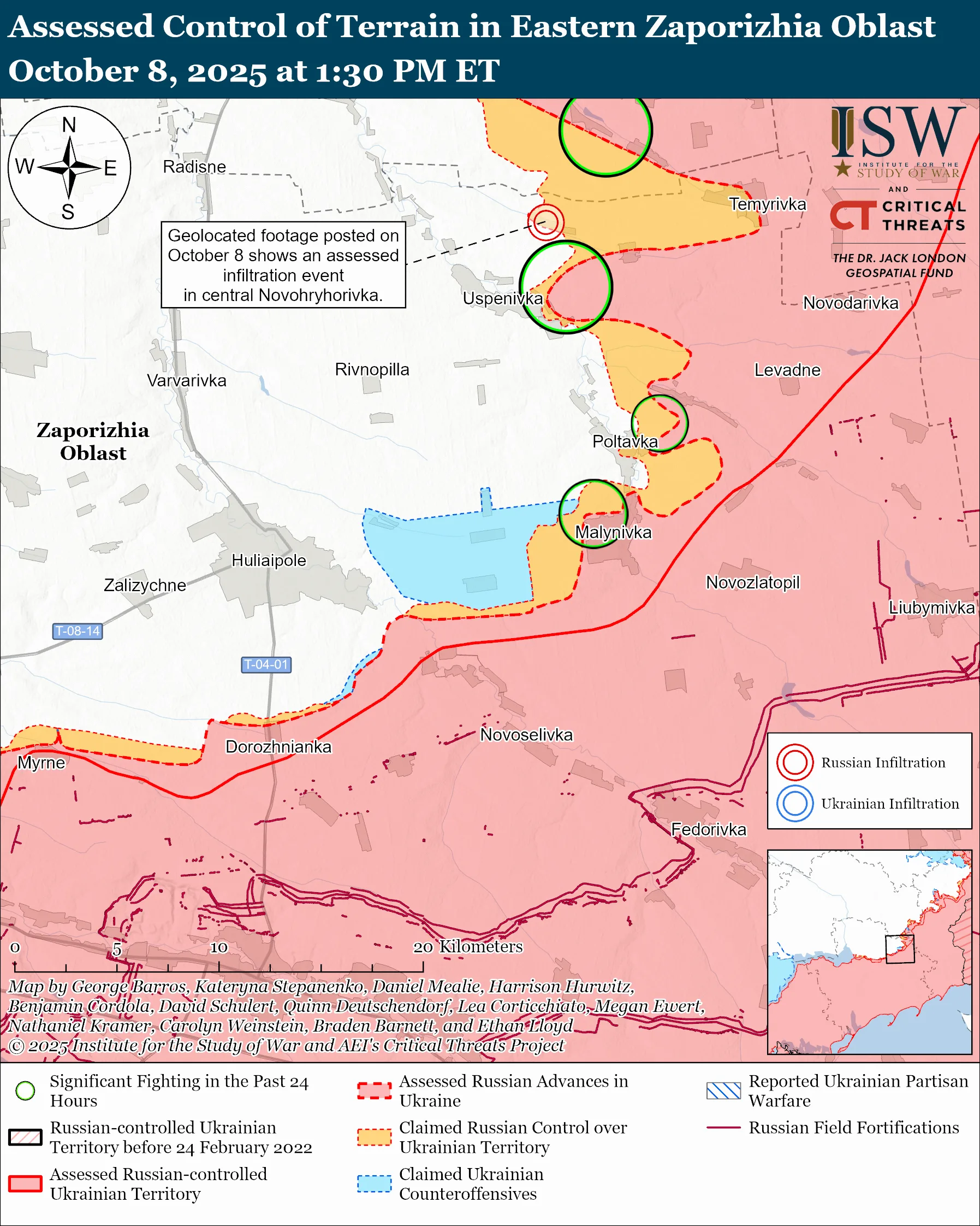 8 жовтня російські війська продовжили штурмові дії на сході Запорізької області, однак підтвердженого просування не зафіксовано. Бої точилися у районах Новогригорівки, Новоіванівки, Охотничого, Полтавки та Малинівки.