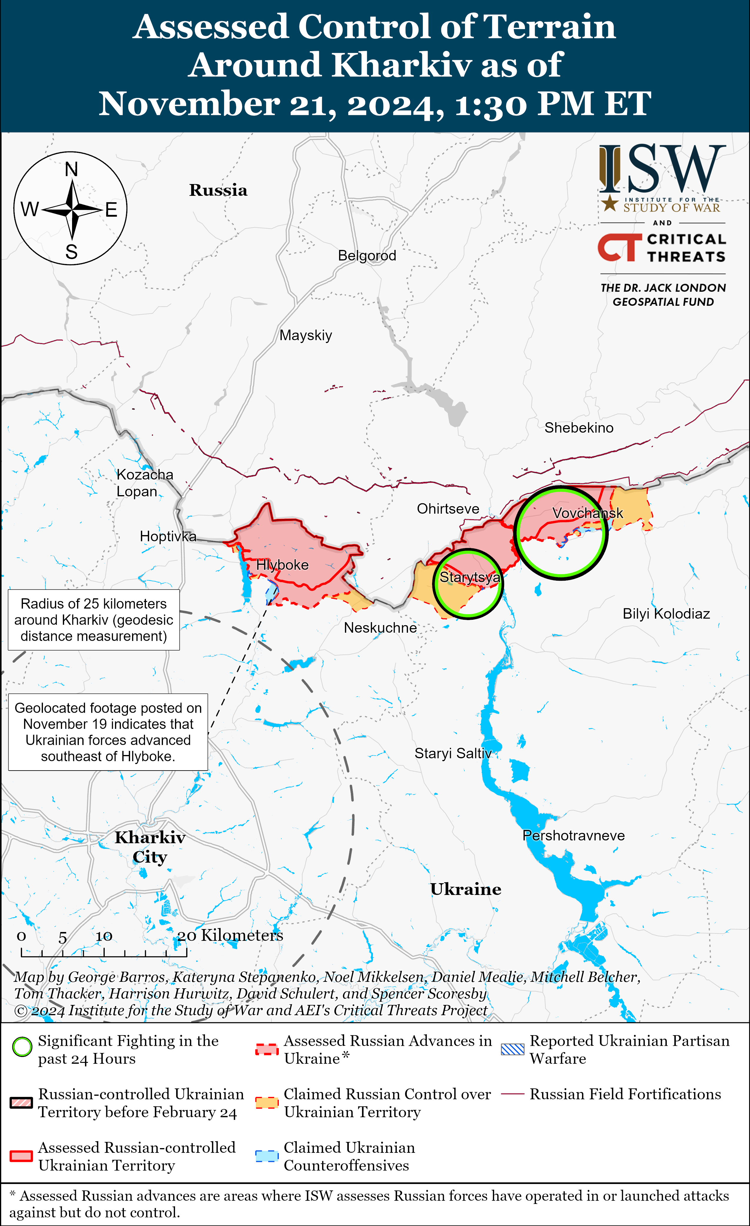 - Російські війська 20 і 21 листопада продовжували наступальні операції на північний схід від Харкова поблизу Вовчанська і Стариці, але не зробили жодного підтвердженого просування.
