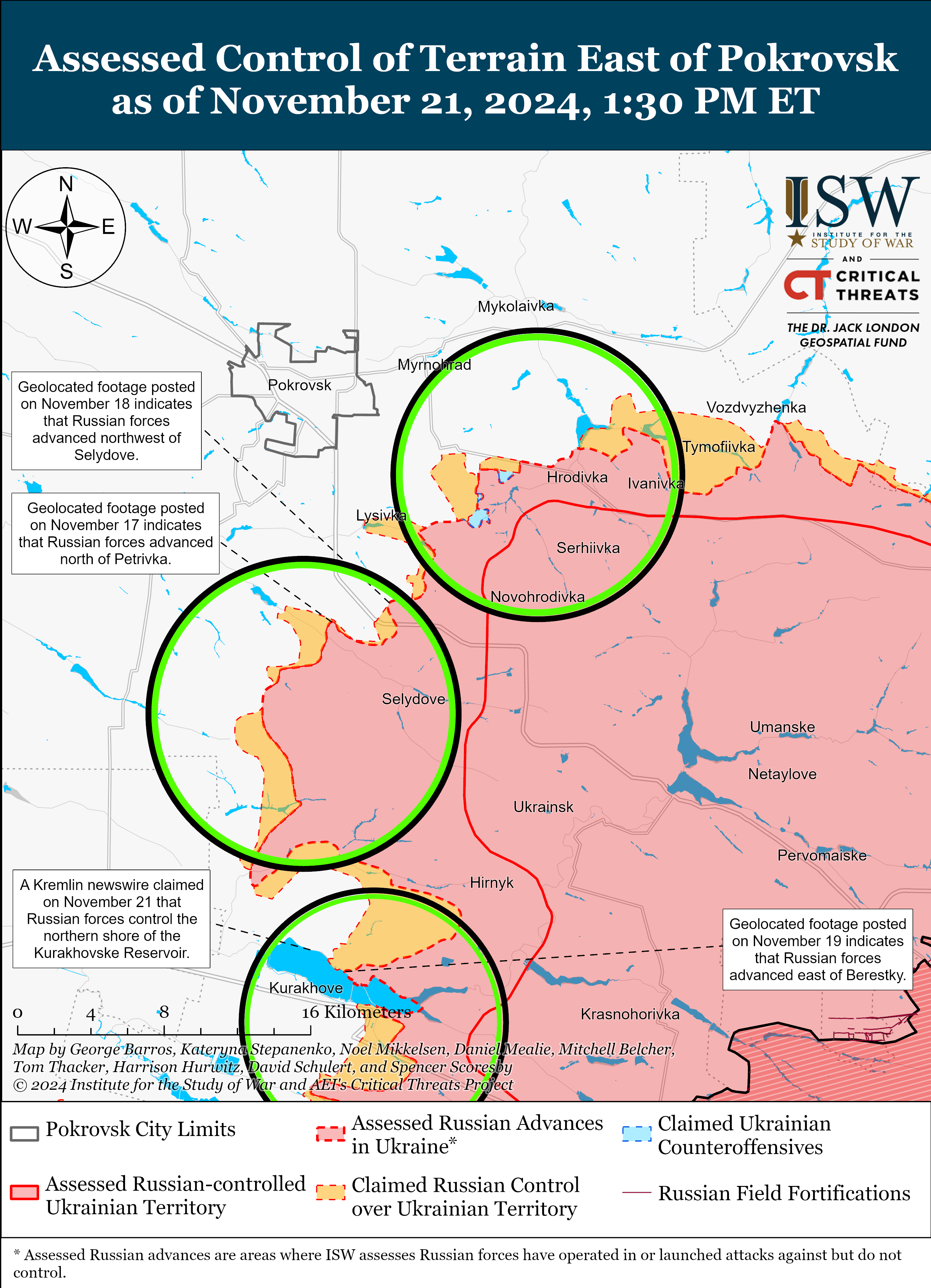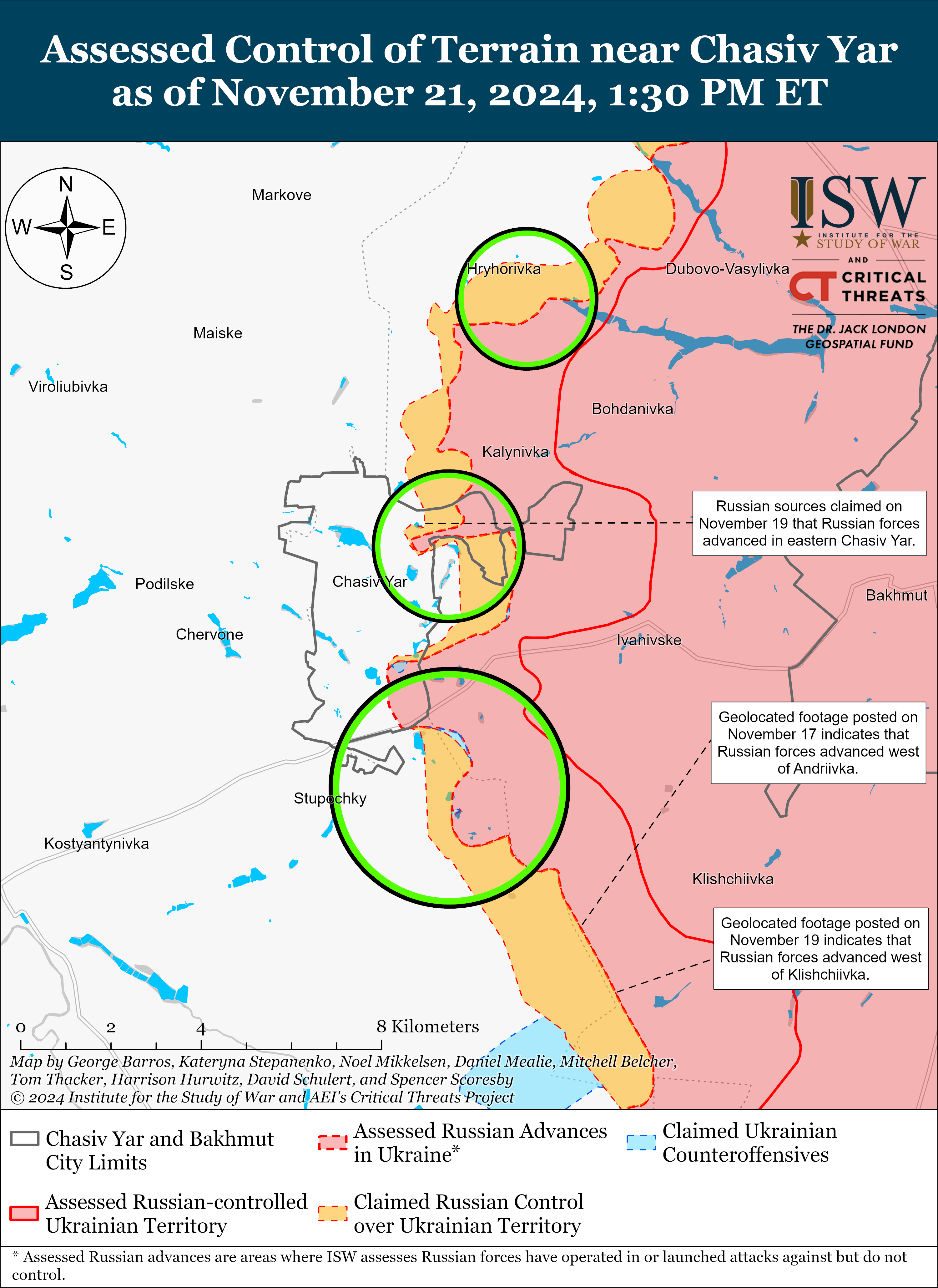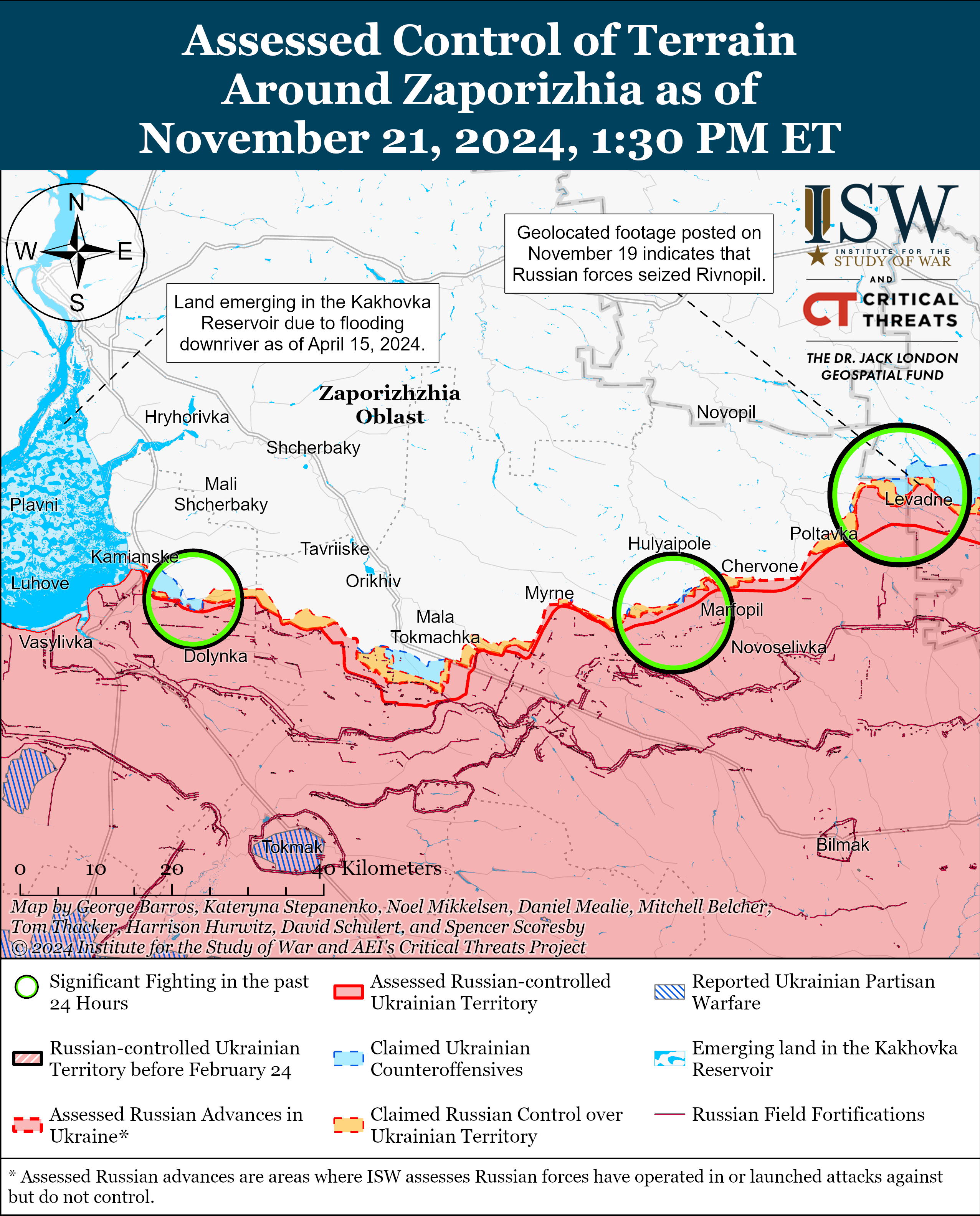 - 21 листопада в Росії заявили, що просунулися в північні околиці Дорожнянки на південь від Гуляйполя, але ISW не знайшов підтвердження.