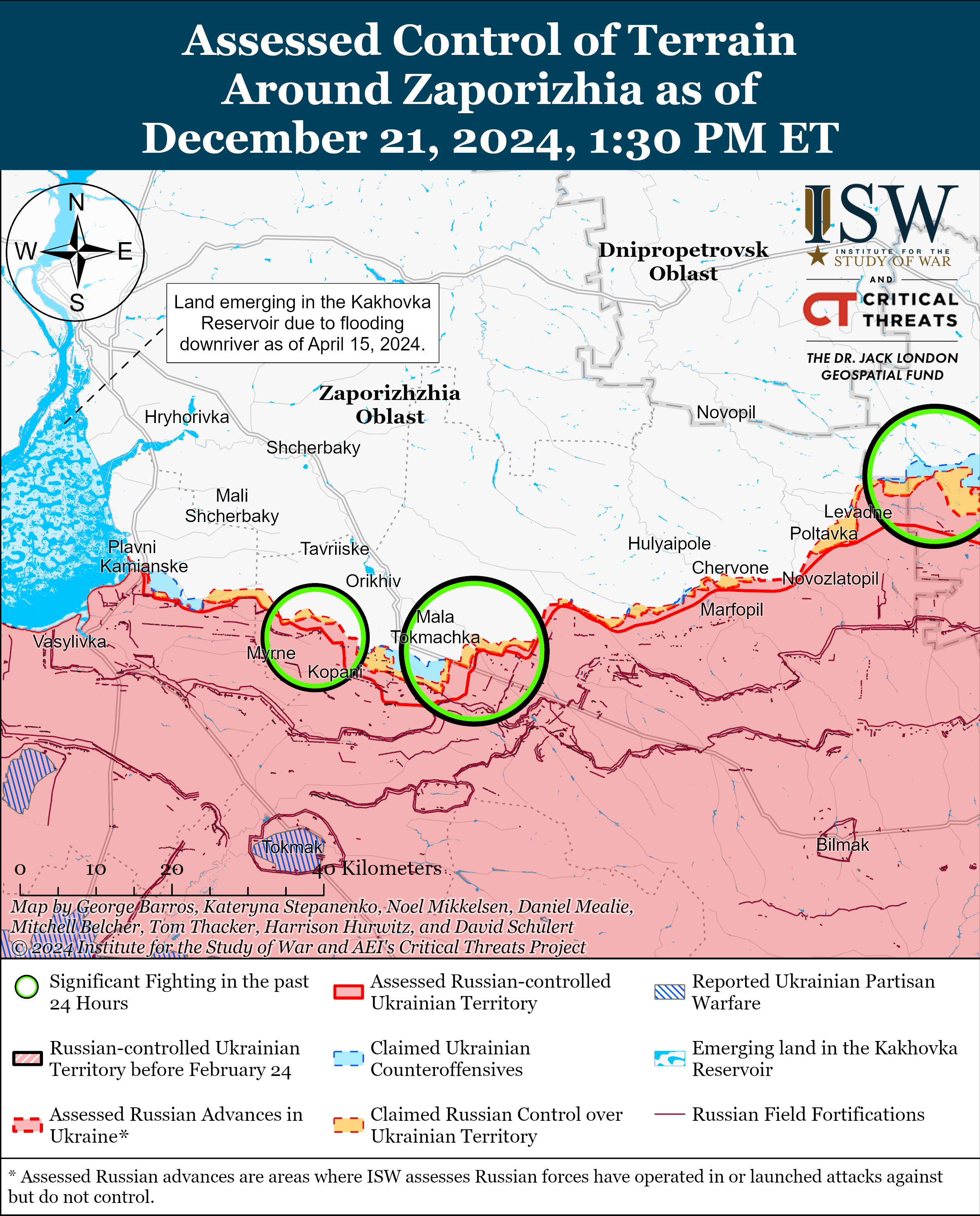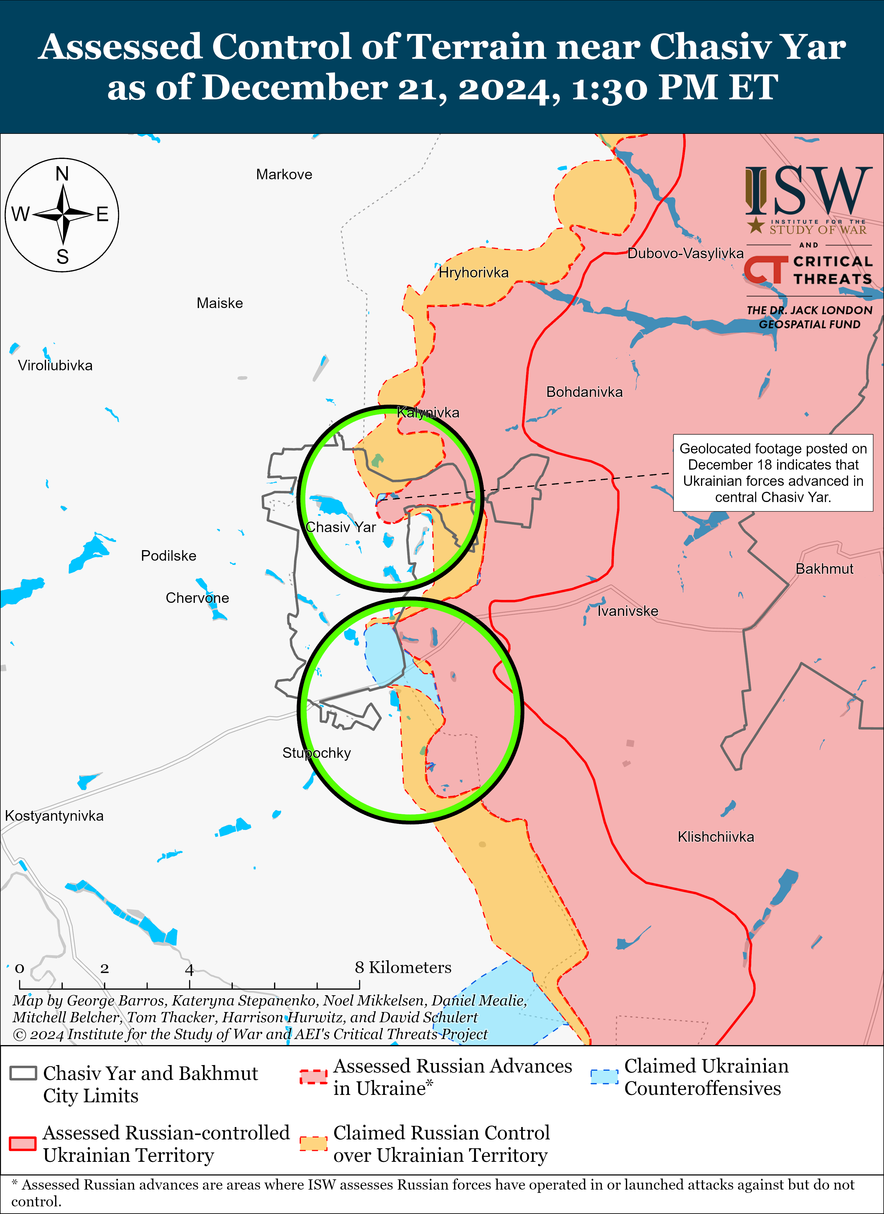 - Російські сили наступали вздовж кордону на північ від міста Харків поблизу Козачої Лопані та поблизу Вовчанська 20 і 21 грудня, але не зробили жодного підтвердженого просування.