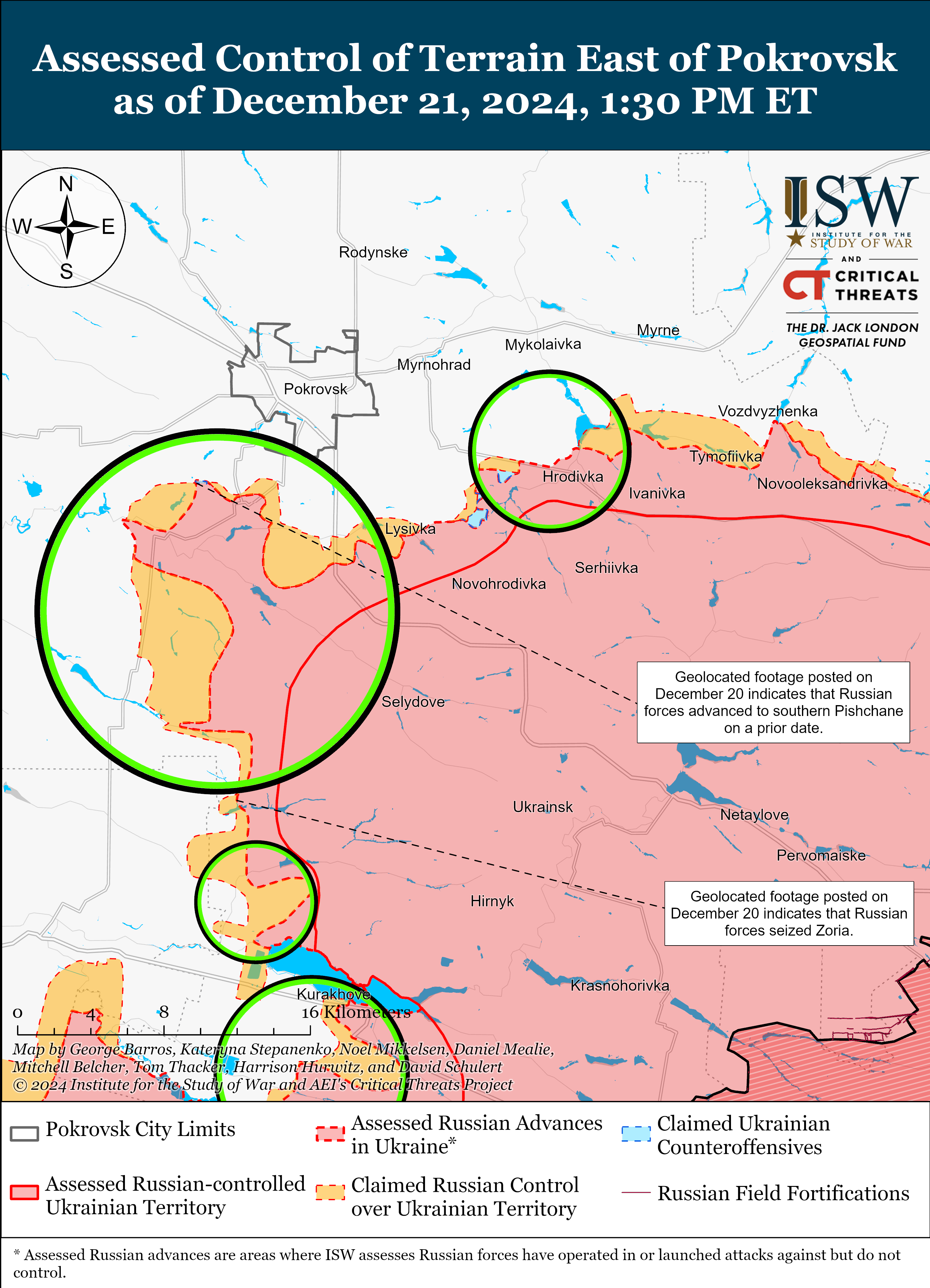 - Російські та українські сили 20 і 21 грудня просунулися на південний захід від Покровська. Геолокаційні кадри показують, що ЗСУ відбили позиції в південному Піщаному (на південний захід від Покровська). Але це свідчить і про те, що росіяни просунулися до цього населеного пункту.