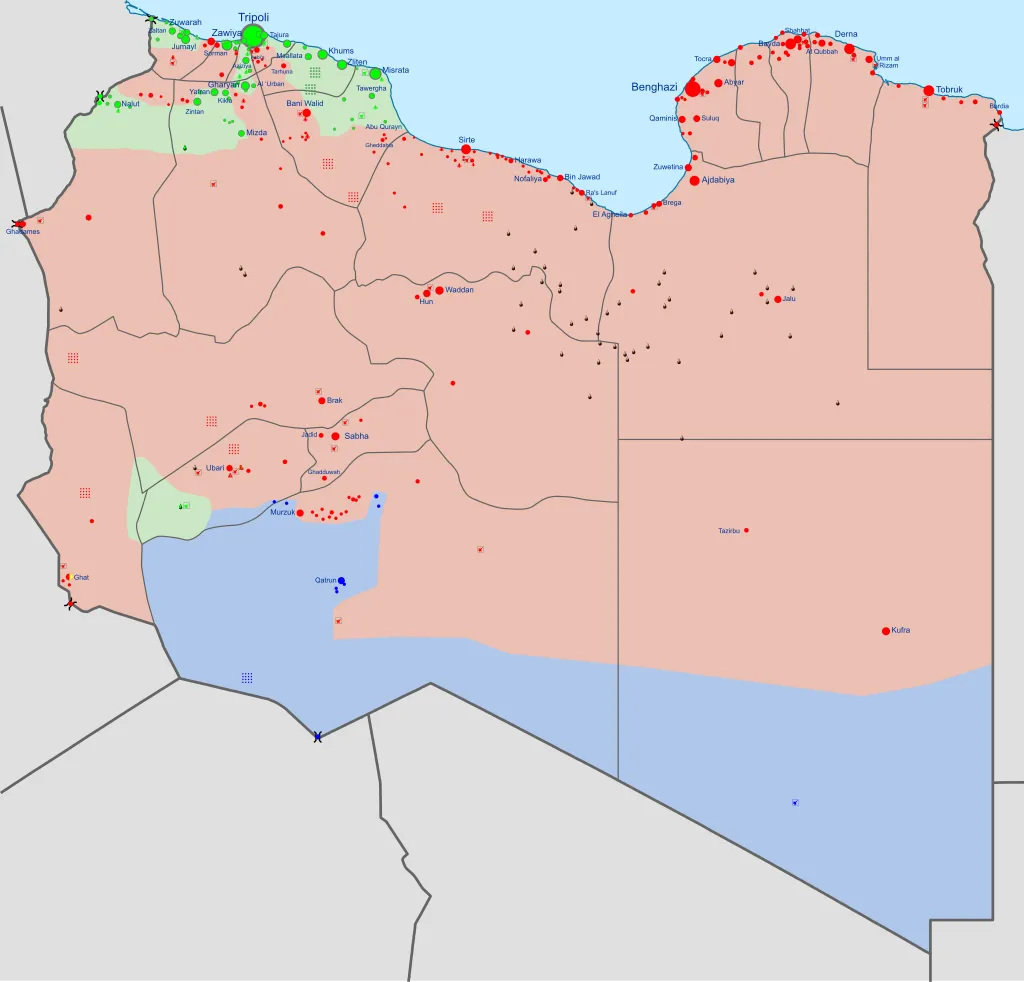 Карта сучасної ситуації у Лівії: червоне – сили Хафтара, зелене – сили Фарраджа, синє – місцеві сили/ Фото: Wikipedia