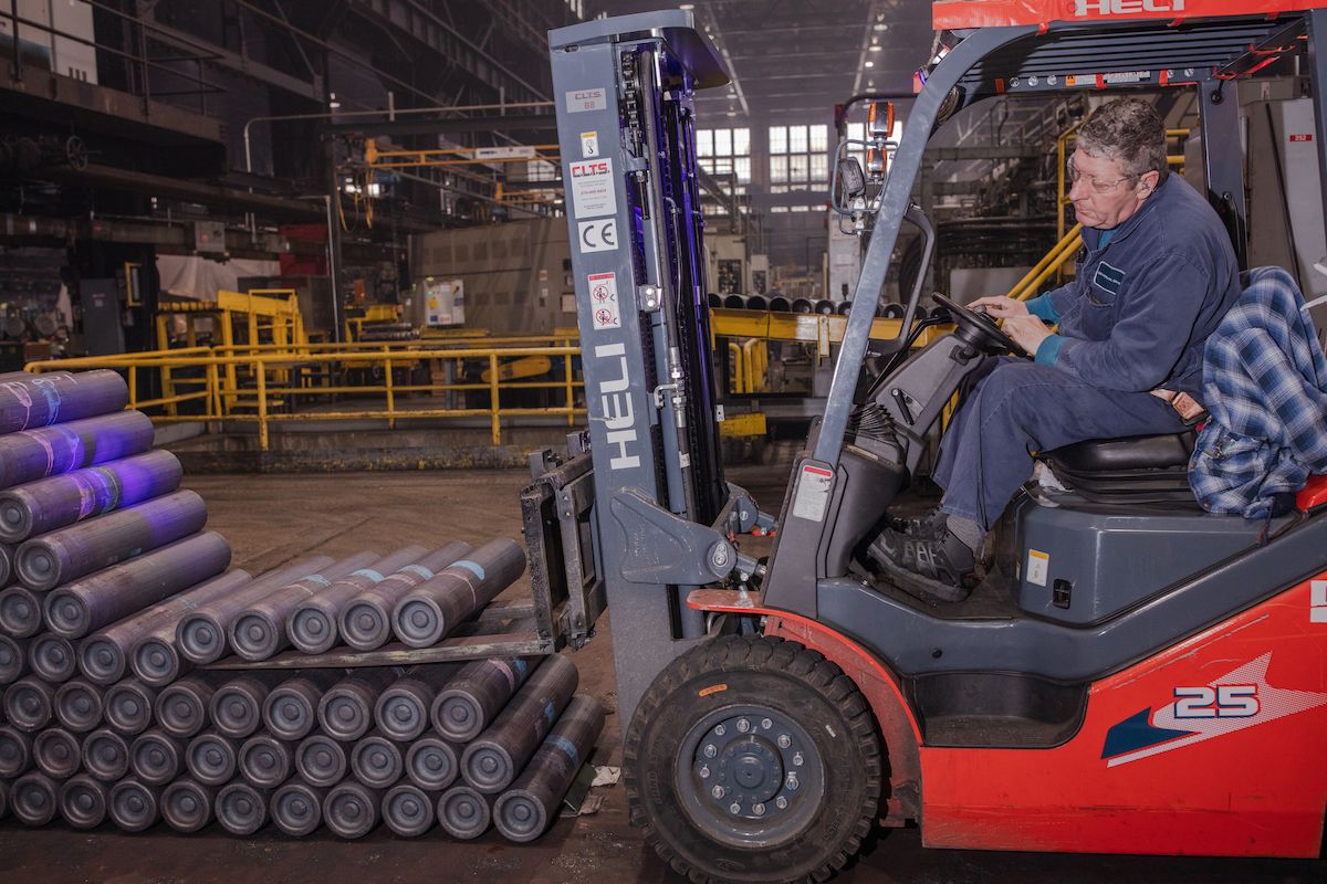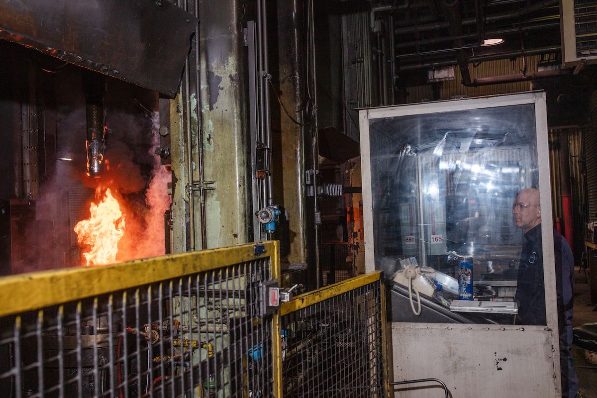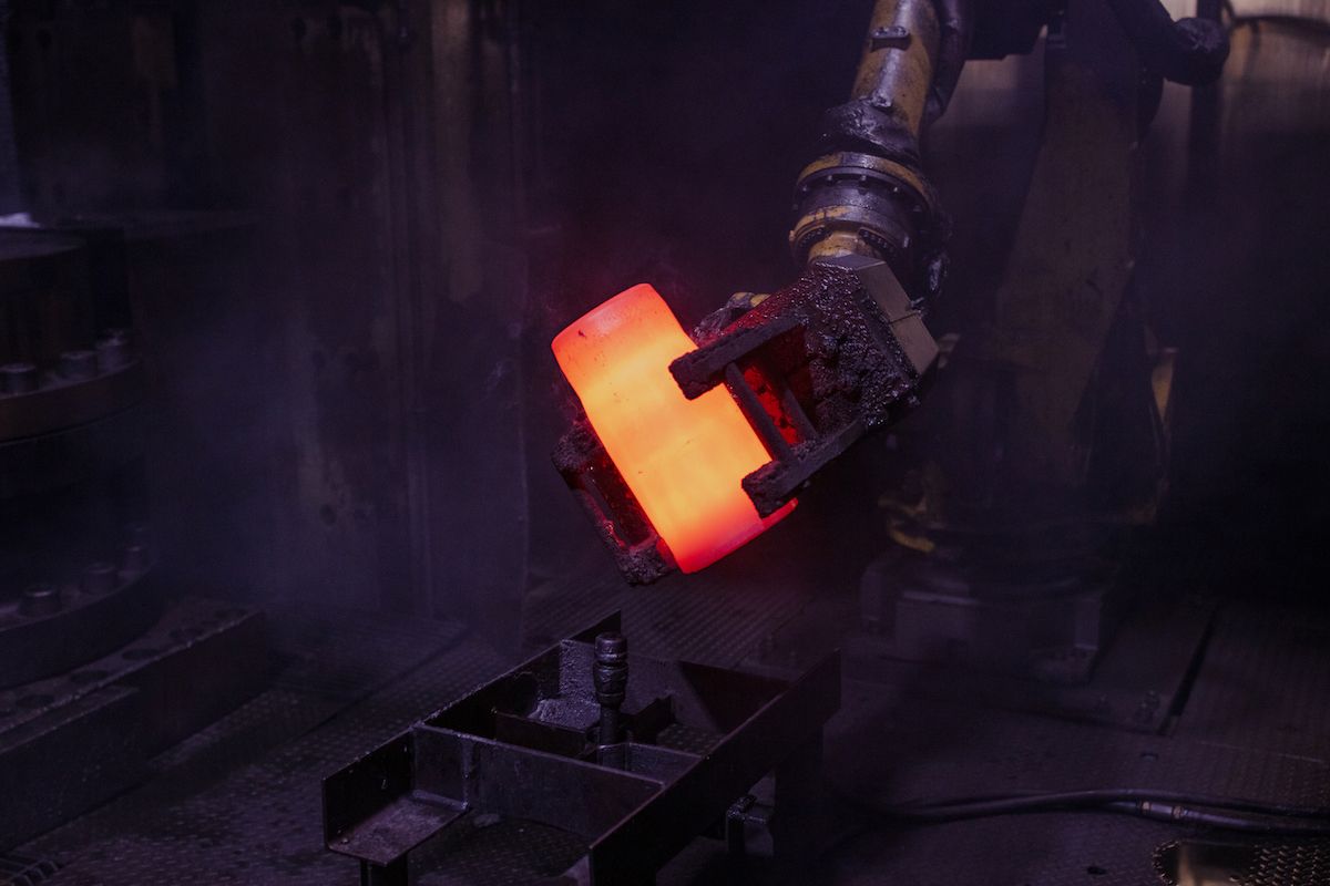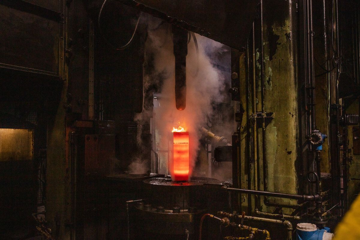 Цікаво, що частину процесу виконує велика роботизована рука. Вона подає заготовки до печі, яка працює на природному газі. Температура у ній сягає до 2000 градусів. Там розпечені металеві циліндри тримають упродовж понад години. Після цього їх ставлять на гірку.