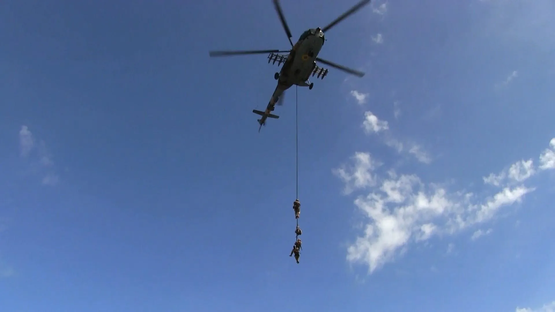 Вертоліт підіймає у небо, прив’язаних до тросу військових