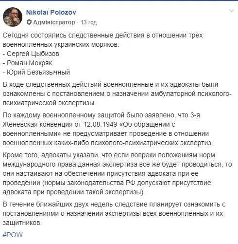 Якщо росіяни вирішать всупереч положенням норм міжнародного права все ж проводити цю експертизу, Україна наполягатиме на присутності адвокатів під час її проведення. Про це повідомив адвокат українських моряків Микола Полозов.