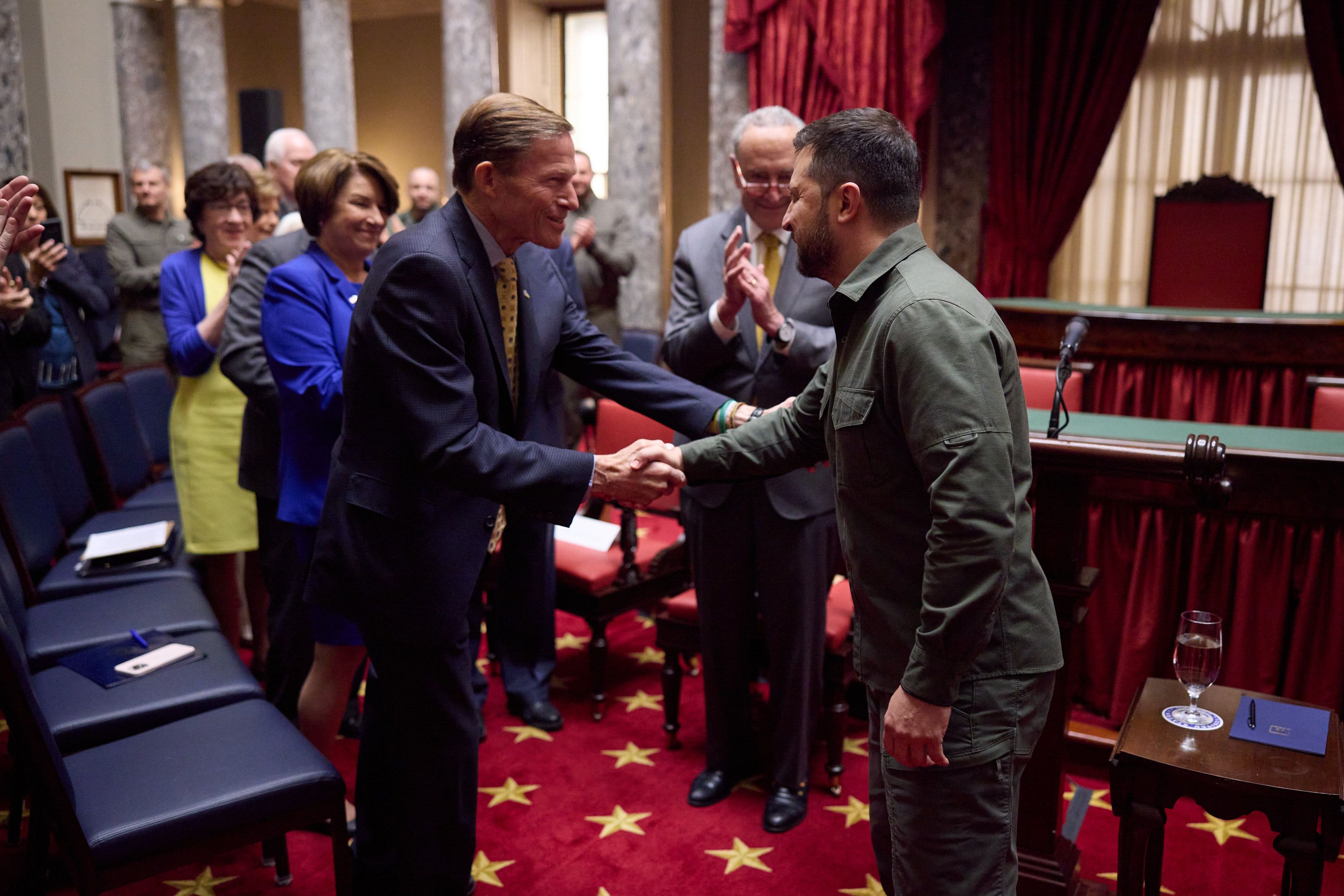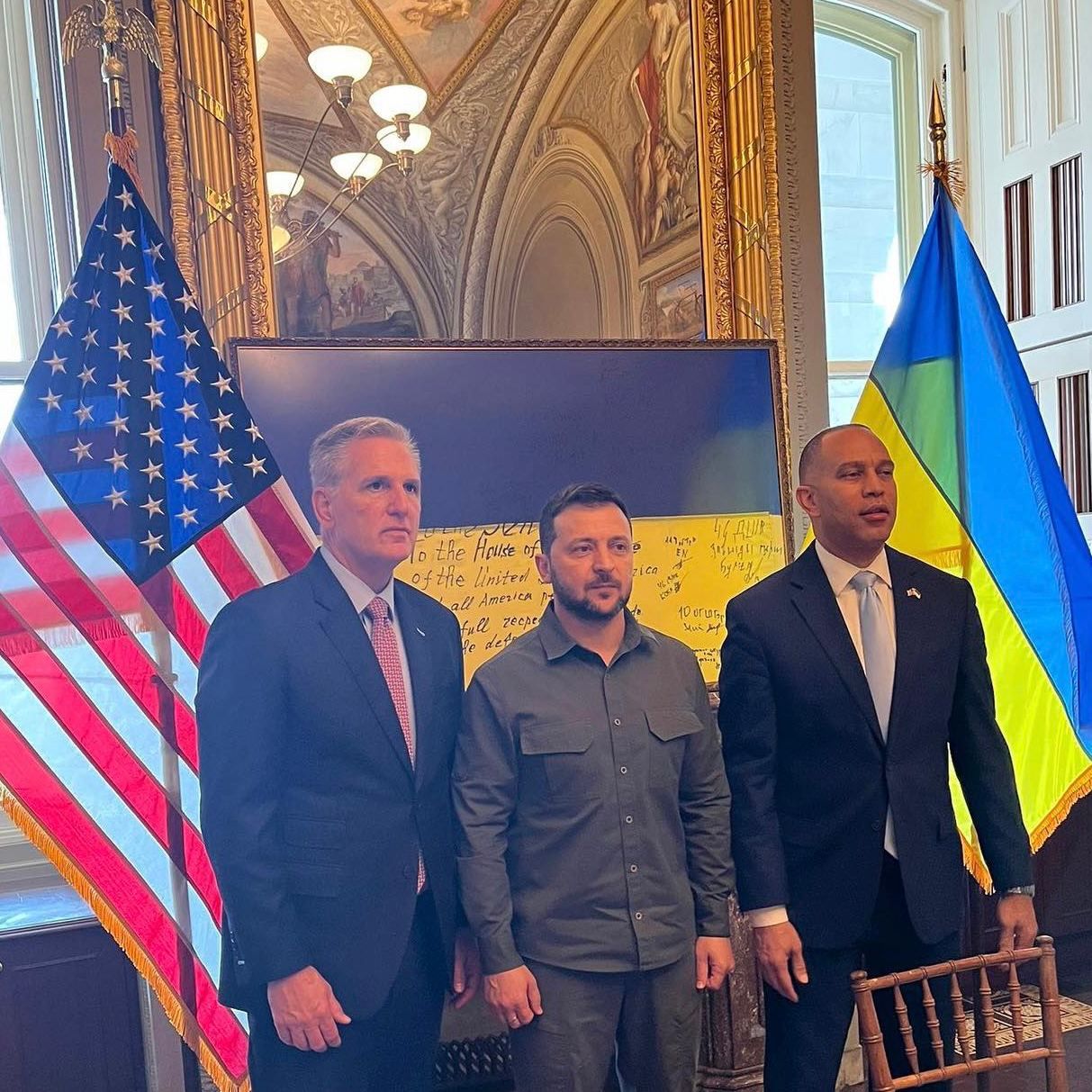 Володимир Зеленський зустрівся зі спікером Палати представників Конгресу США Кевіном Маккарті, а також з лідерами Республіканської та Демократичної партій в Палаті представників. А саме зі Стівом Скалізом та Хакімом Джефрісом.