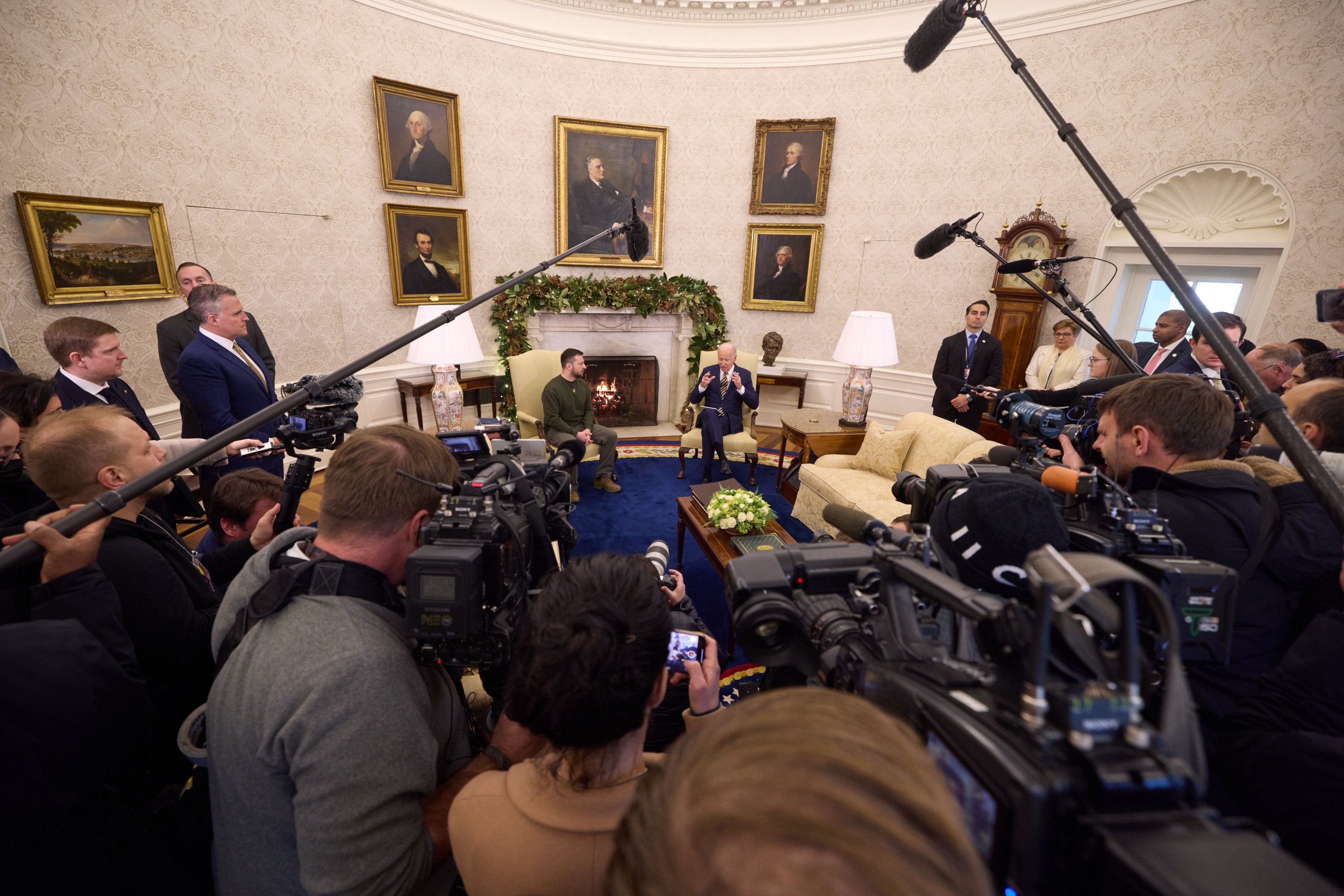 Близько 22:00 американські ЗМІ повідомили, що розпочались переговори між американським та українським лідерами. Одразу стало відомо, що Зеленський передав Байдену нагороду та лист солдата, з яким він зустрівся напередодні у Бахмуті.
