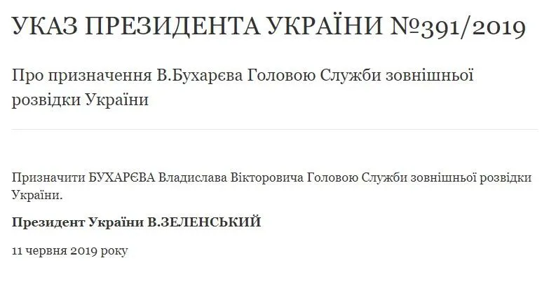 Указ про призначення Бухарєва головою Служби зовнішньої розвідки
