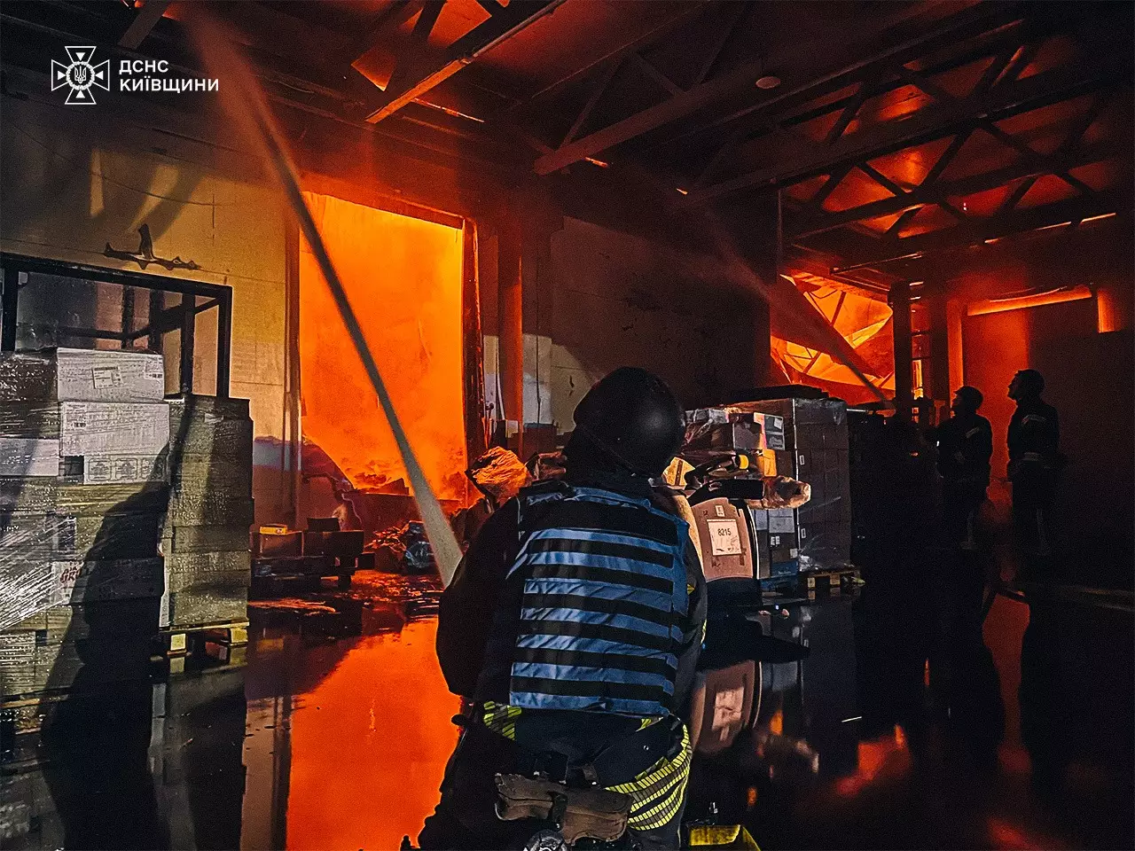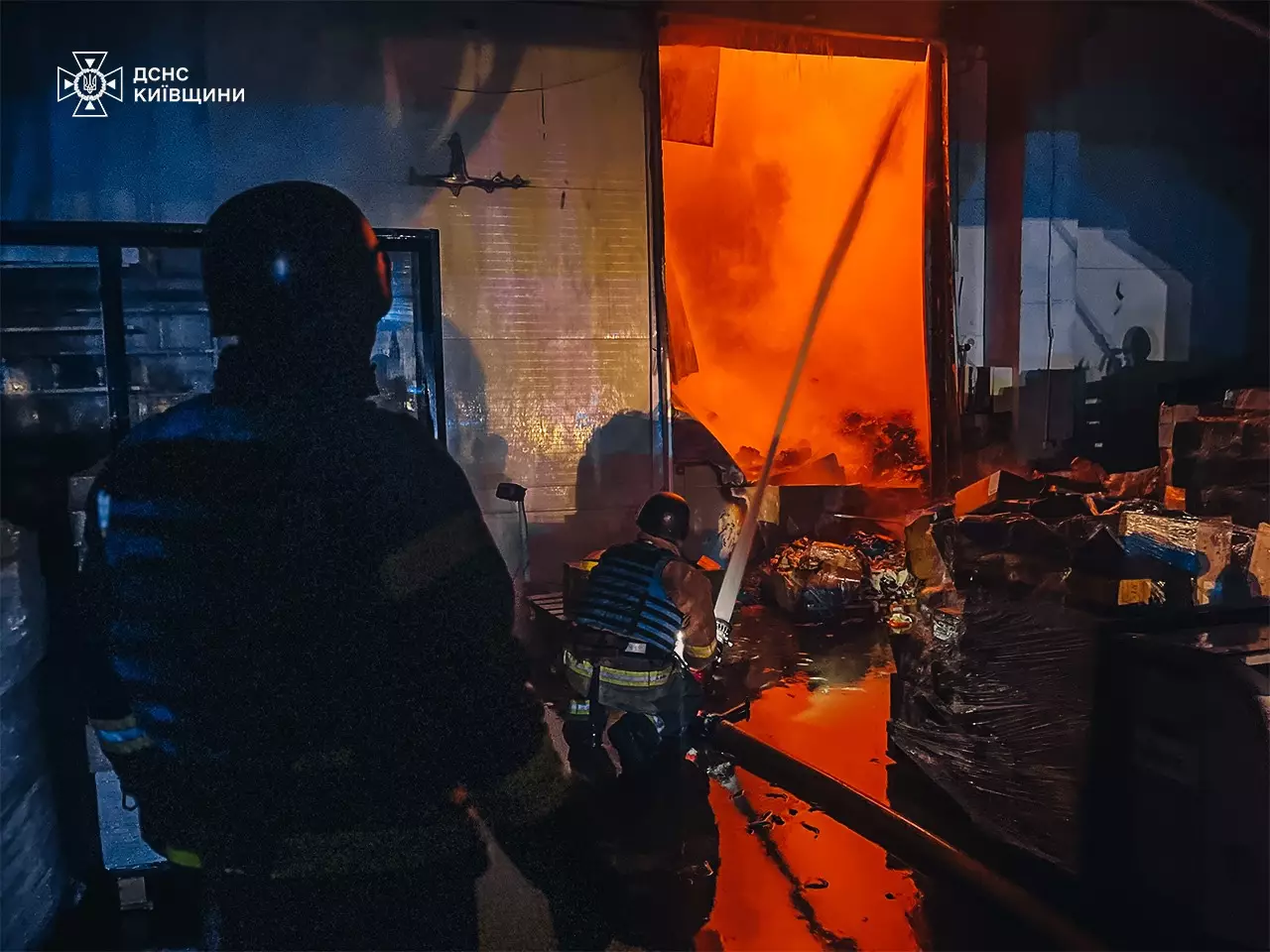 О 00:50 внаслідок чергової російської атаки безпілотниками на території Бориспільського району сталося загоряння складського приміщення площею 15 000 метрів квадратних.