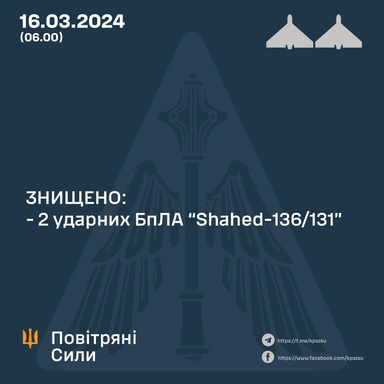 "У ніч на 16 березня 2024 року Силами оборони України знищено 2 із 2 ударних БпЛА типу "Шахед"", – ідеться у повідомленні.