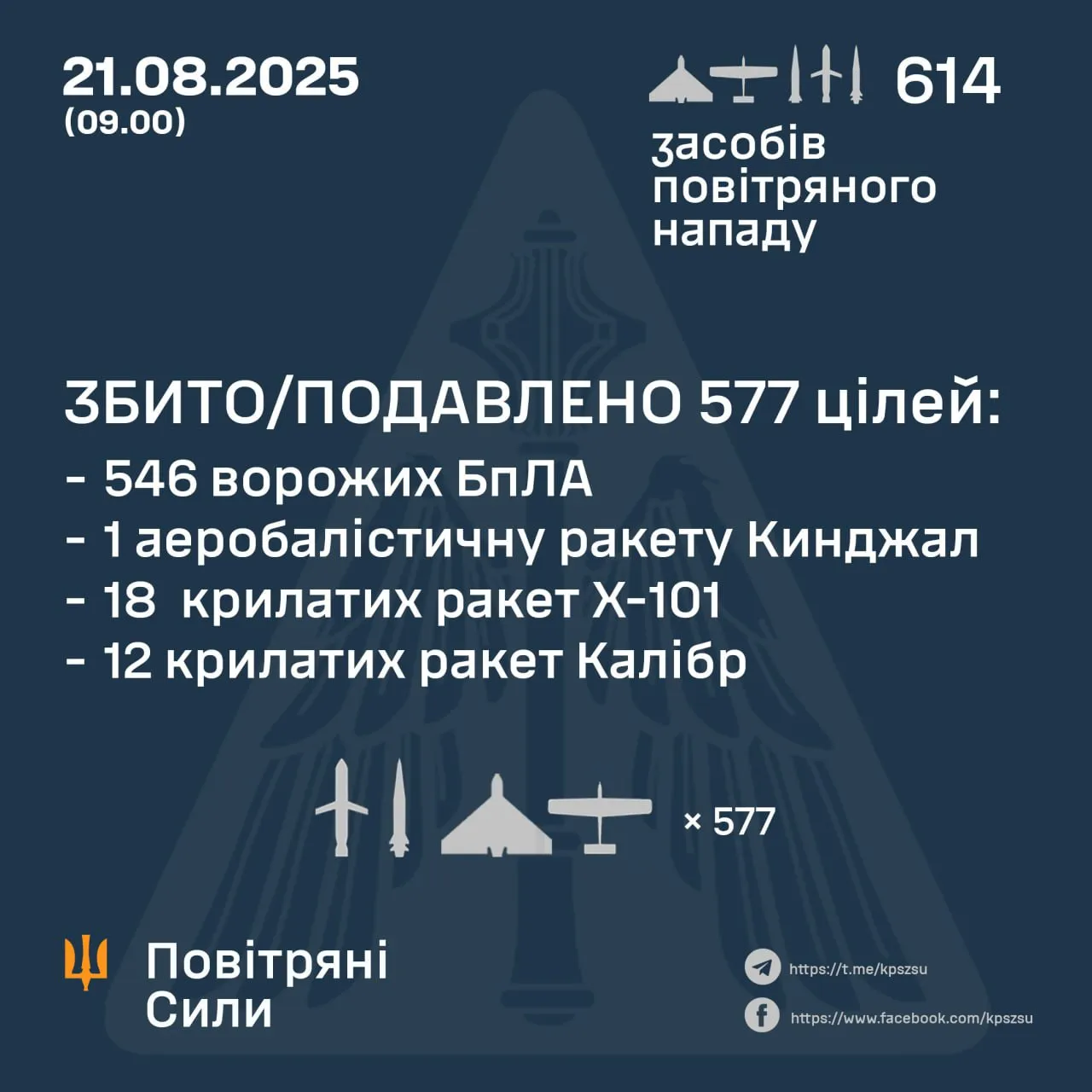 У ніч проти 21 серпня російські війська для удару застосували 614 засобів повітряного нападу. Зокрема, ворога атакував 574 ударними БпЛА типу Shahed і безпілотниками-імітаторами різних типів.