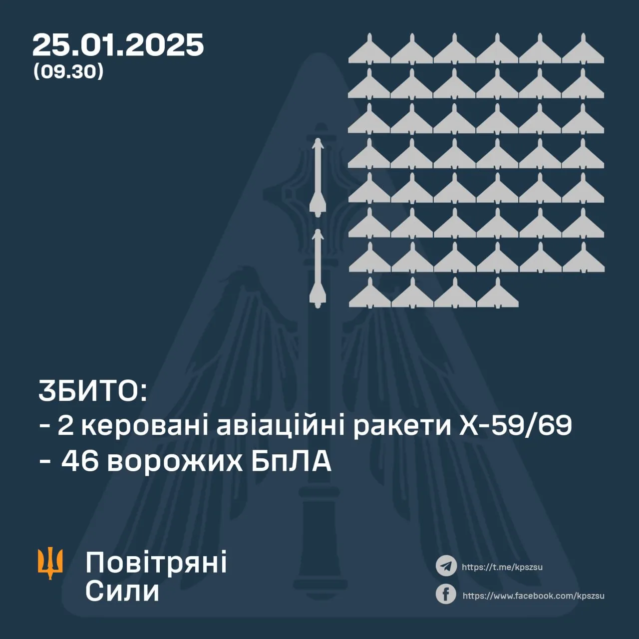 Станом на 09:30 підтверджено збиття двох керованих авіаційних ракет Х-59/69 та 46 ударних БпЛА типу Shahed та безпілотників інших типів у Одеській, Харківській, Полтавській, Сумській, Київській, Черкаській, Донецькій, Запорізькій, Дніпропетровській, Хмельницькій і Кіровоградській областях,