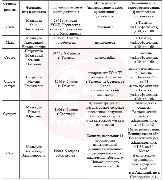 Прописаний полковник у селищі Єлизаветинка Всеволожського району Ленінградської області. Там ще зареєстровані його дружина Тетяна (паспорт 4111 431848) та син Олександр (4109 270442), а також онучка Олександра (IV-АК 776698). Прийомного ж онука Деміда (III-АК726198) Малькута за цією адресою чомусь не прописав.