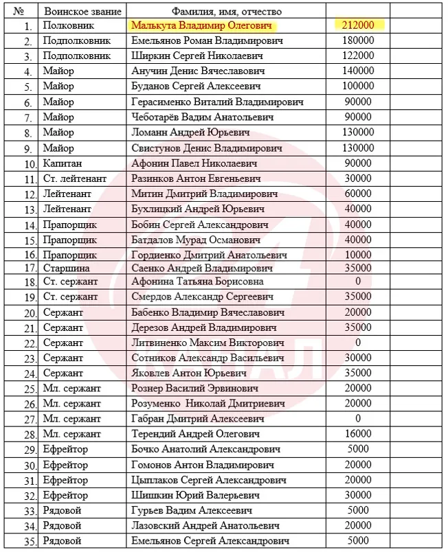 Що ж стосується фінансового стану окупанта, то бідною людиною назвати його аж ніяк не можна. Принаймні станом на 2017 рік Малькута як командир частини мав оклад у 212 тисяч рублів на місяць (приблизно 3500 доларів за тодішнім курсом). Скільки офіційно заробляє полковник зараз, невідомо, однак точно не меншу суму, особливо з урахуванням всеможливих премій та доплат.