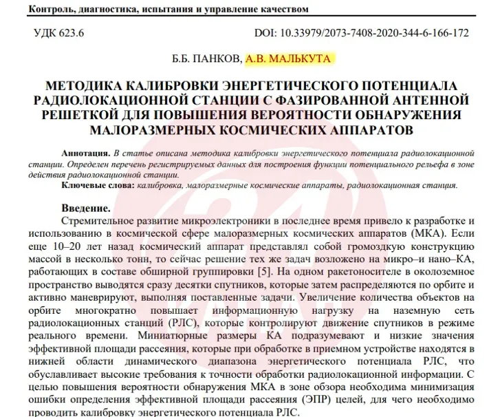 Чим саме займався у технополісі Малькута-молодший, невідомо, але точно не чимось корисним для людства. В одному з наукових журналів у 2020 році було опубліковано статтю за його співавторства: "Методика калібрування енергетичного потенціалу радіолокаційної станції з фазованими антенними ґратами для підвищення ймовірності виявлення малорозмірних космічних апаратів".