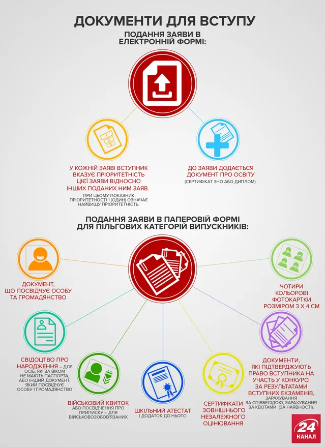 Документи подаватимуться лише в електронному вигляді, а сертифікати ЗНО будуть автоматично підвантажуватися в електронному кабінеті зареєстрованого вступника. Довантажити потрібно буде лише скан-копію додатка до атестату. А уже після зарахування необхідно подати оригінали атестату та інших необхідних документів.