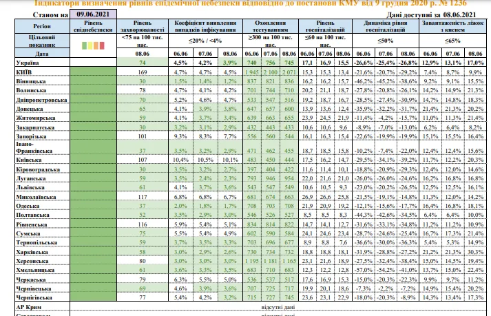 Так, усі регіони тепер відповідають показникам зеленої зони. Наприклад, показник рівня захворюваності по всій Україні становить 74.