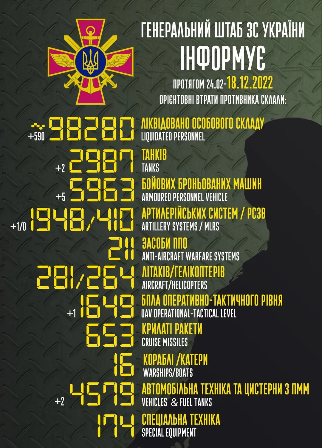 Актуальні втрати ворога станом на 18 грудня / Інфографіка Генштабу ЗСУ