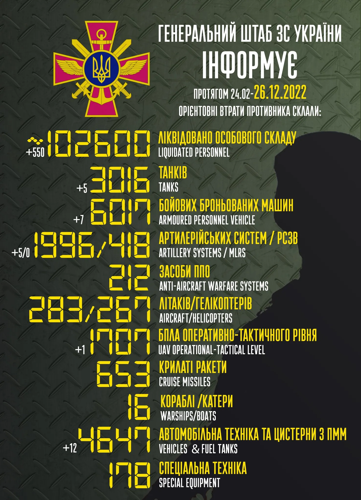 Загальні бойові втрати Росії станом на 26 грудня складають 102 600 військових. Противник також шаленими темпами втрачає й техніку. Зауважимо, що дані неостаточні через високу інтенсивність боїв.