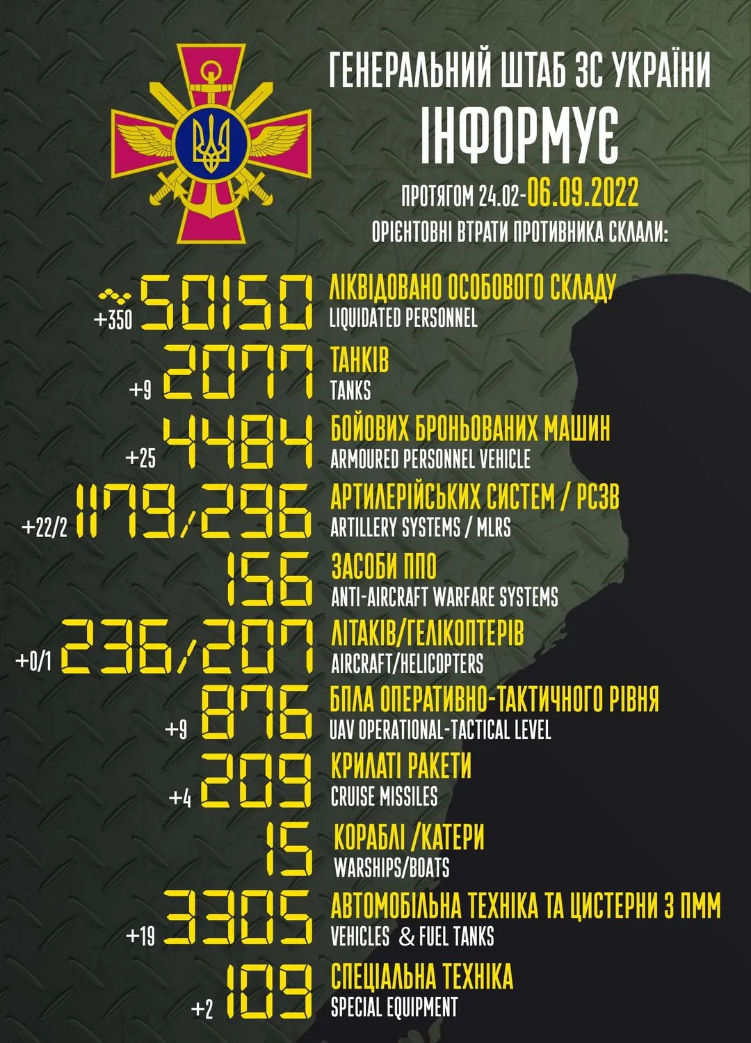 Актуальні втрати ворога станом на 6 вересня 2022 року / Інфографіка Генштабу ЗСУ