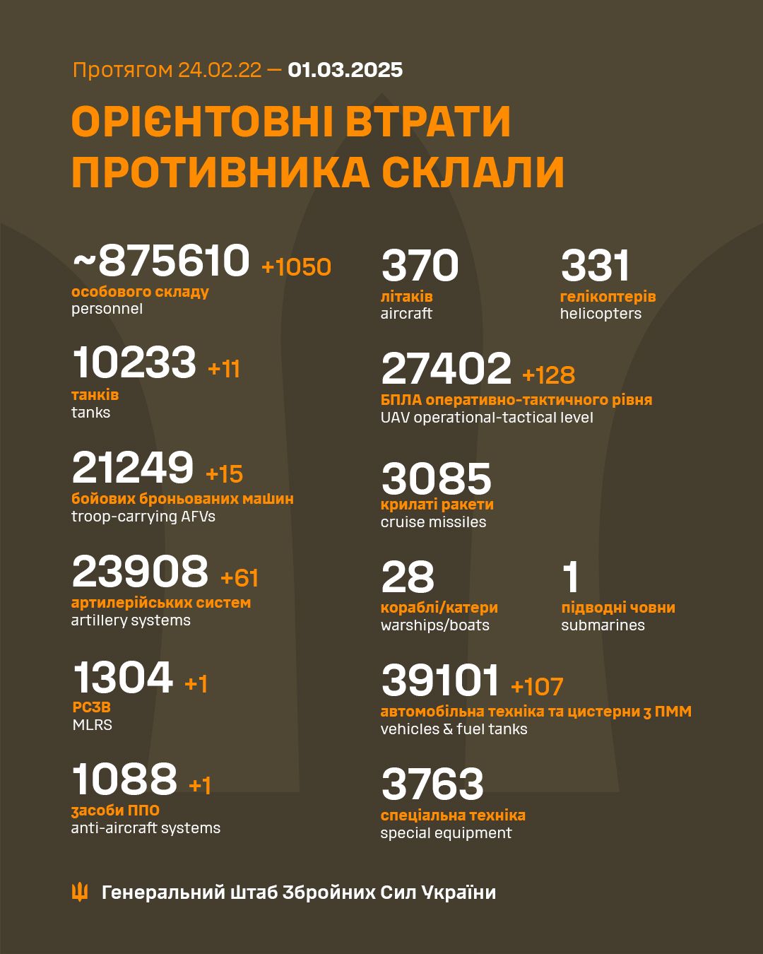 Втрати ворога на 1 березня 2025 року / Інфографіка Генштабу ЗСУ