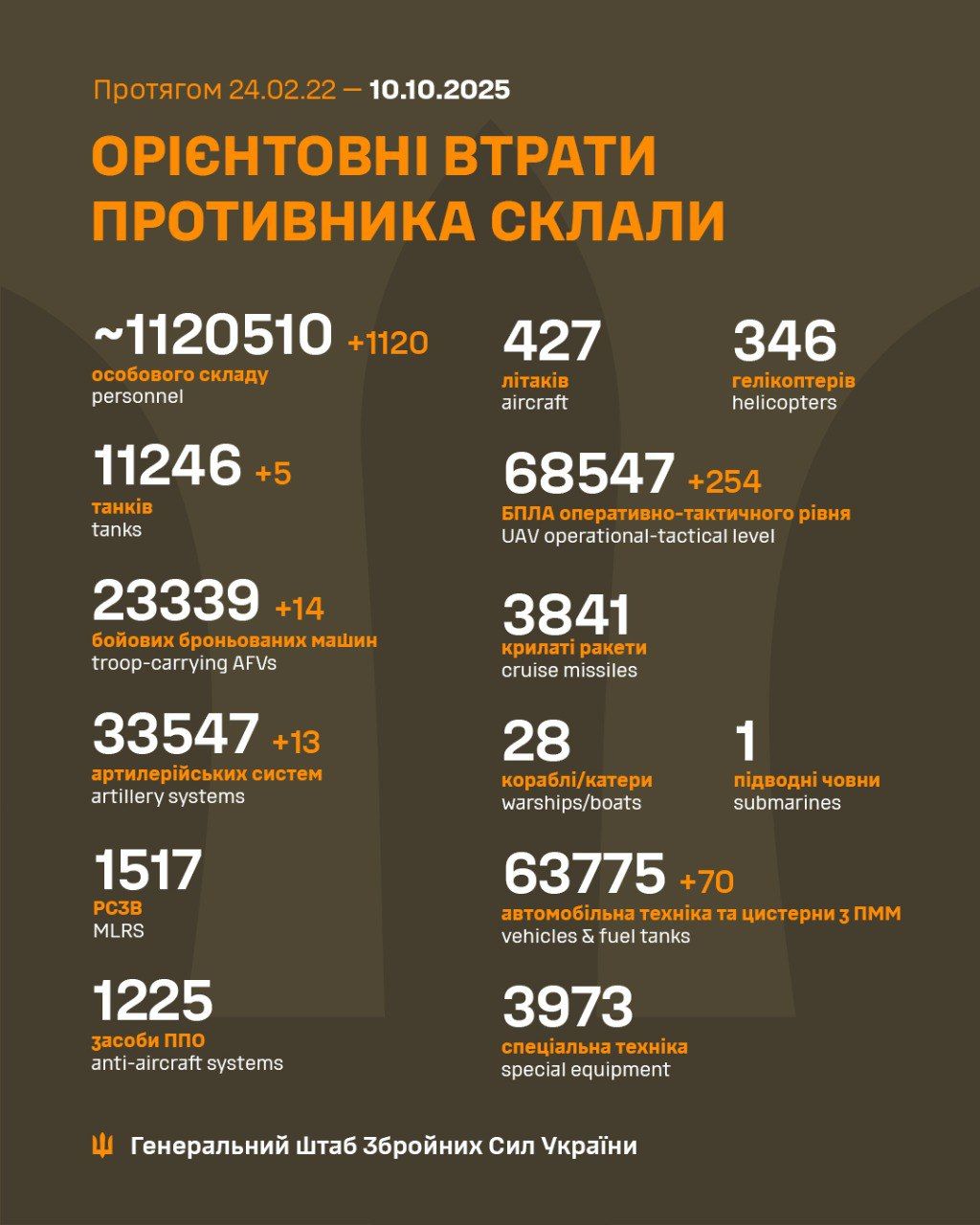 Втрати ворога на 10 жовтня 2025 року / Інфографіка Генштабу ЗСУ