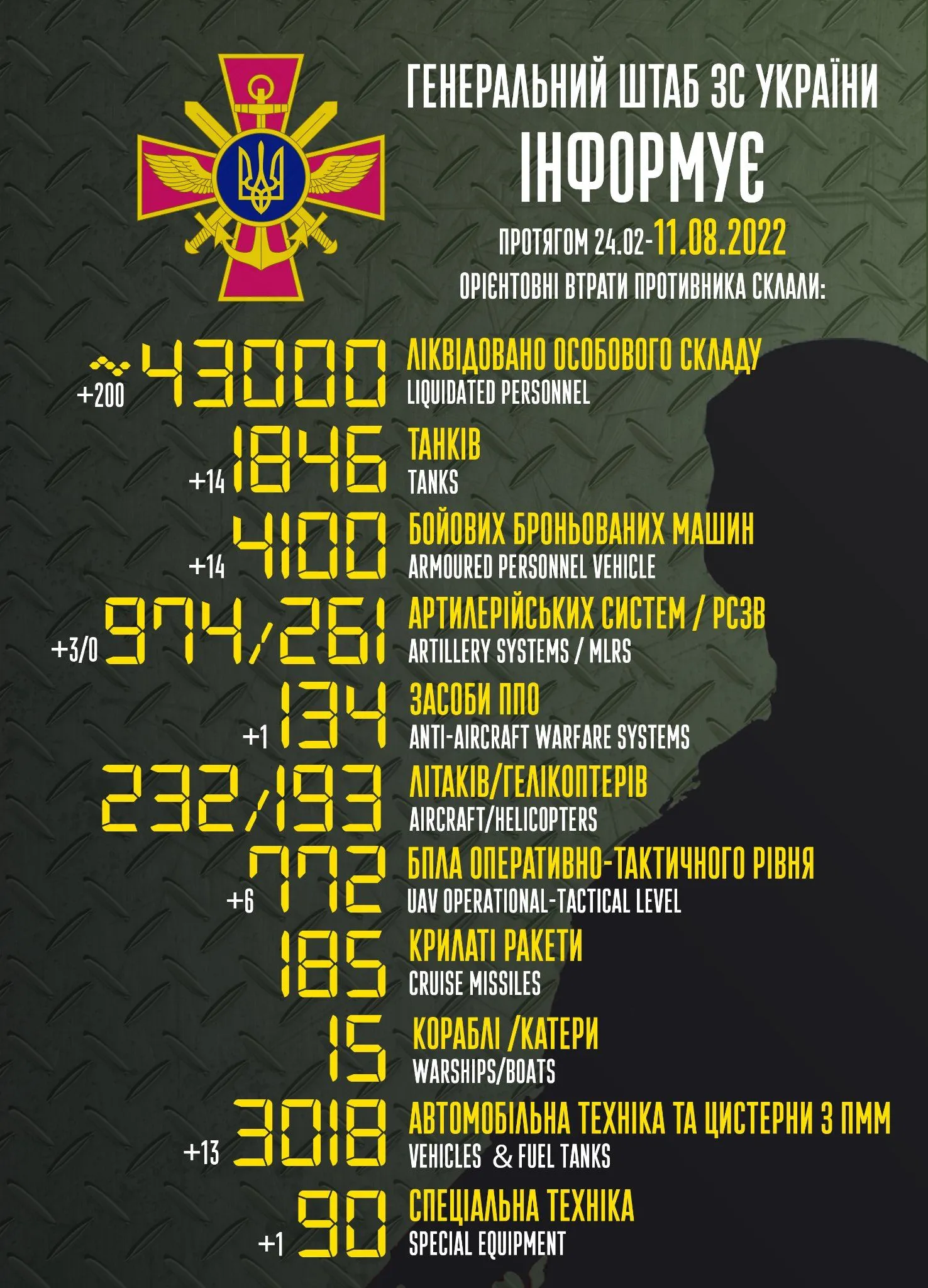 Втрати ворога станом на 11 серпня / Фото Генштаб ЗСУ
