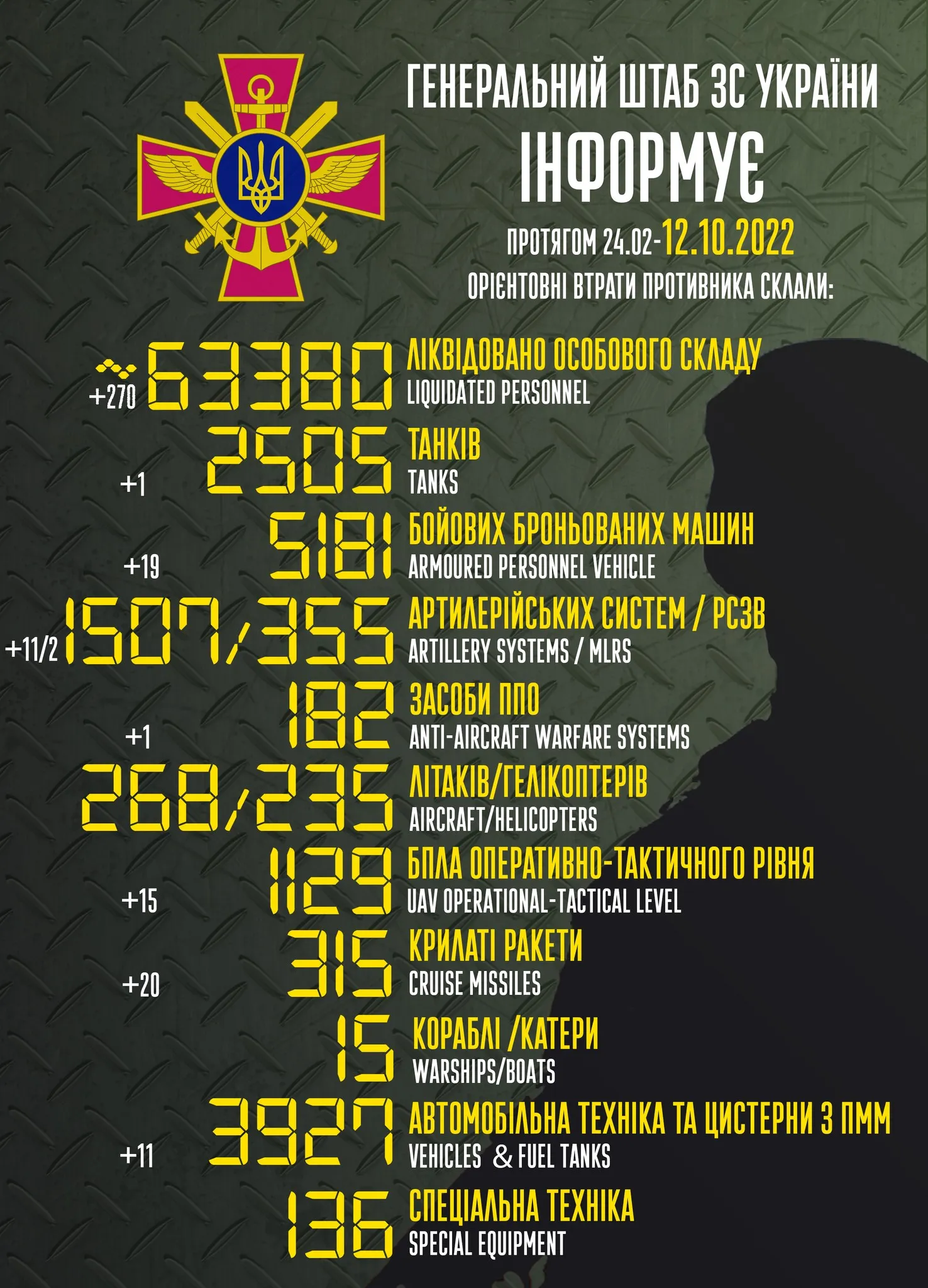 Після традиційного ранкового зведення втрат окупантів, в обід Генштаб оприлюднив уточнені дані втрат російських загарбників. Тож від 24 лютого й з урахуванням всіх наявних на цей час уточнень, станом на 12 жовтня втрати російської армії у повномасштабній війні проти України склали: