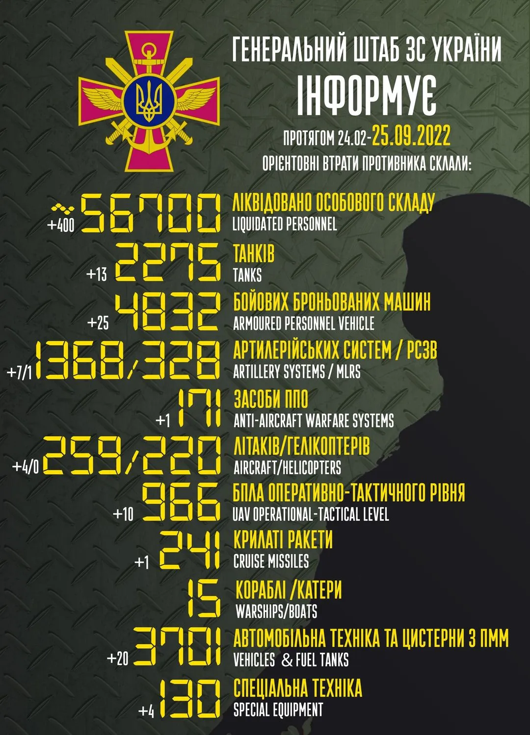 Актуальні втрати ворога станом на 25 вересня / Інфографіка Генштабу ЗСУ
