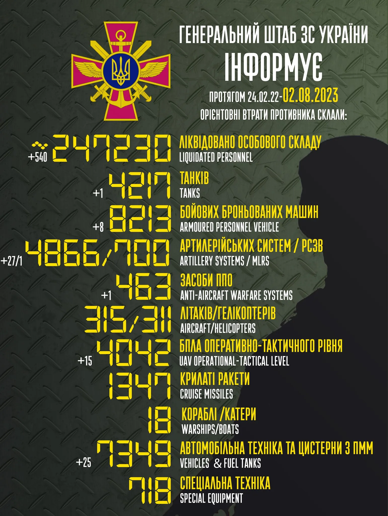 З 24 лютого 2022 року ворог втратив вже 247 230 одиниць особового складу. Проте втрати можуть бути більшими, адже їх важко рахувати через інтенсивні бої.
